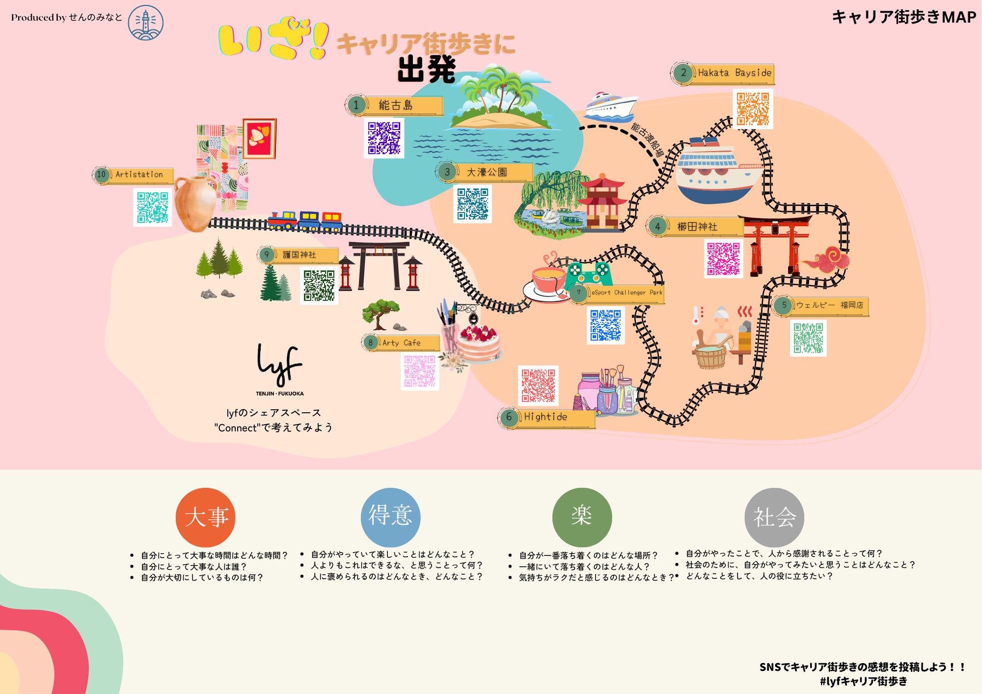 本コラボレーションにより、せんのみなととlyf Tenjin Fukuokaは「キャリア街歩きマップ」の提供を開始します。(※2023年3月1日よりlyf Tenjin Fukuokaにてマップの配布を開始いたします。)