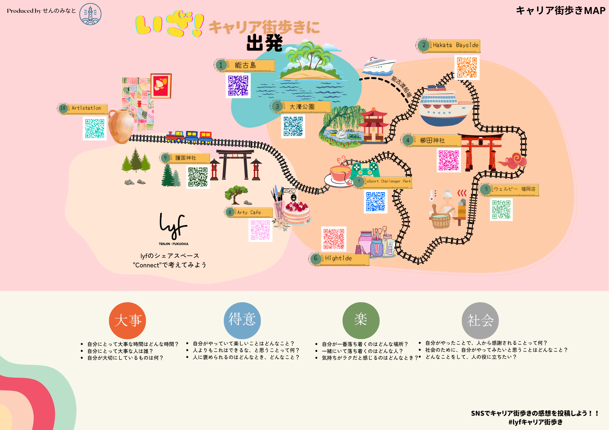 一般的な「旅」とは異なり、せんのみなとが提唱する「人生の旅を楽しむための4つの要素」を盛り込んだ謎解き型街歩きマップを旅のお供にしていただきます。マップはlyf Tenjin Fukuokaのスタッフ(通称「lyfガード」)によるオススメ厳選スポットになっています。当マップを旅のお供にすることで、いつもとは異なる新しい発見やキャリア形成のヒントになるよう設計しています。新しい旅の形「キャリアツーリズム」を是非、ご体験ください。