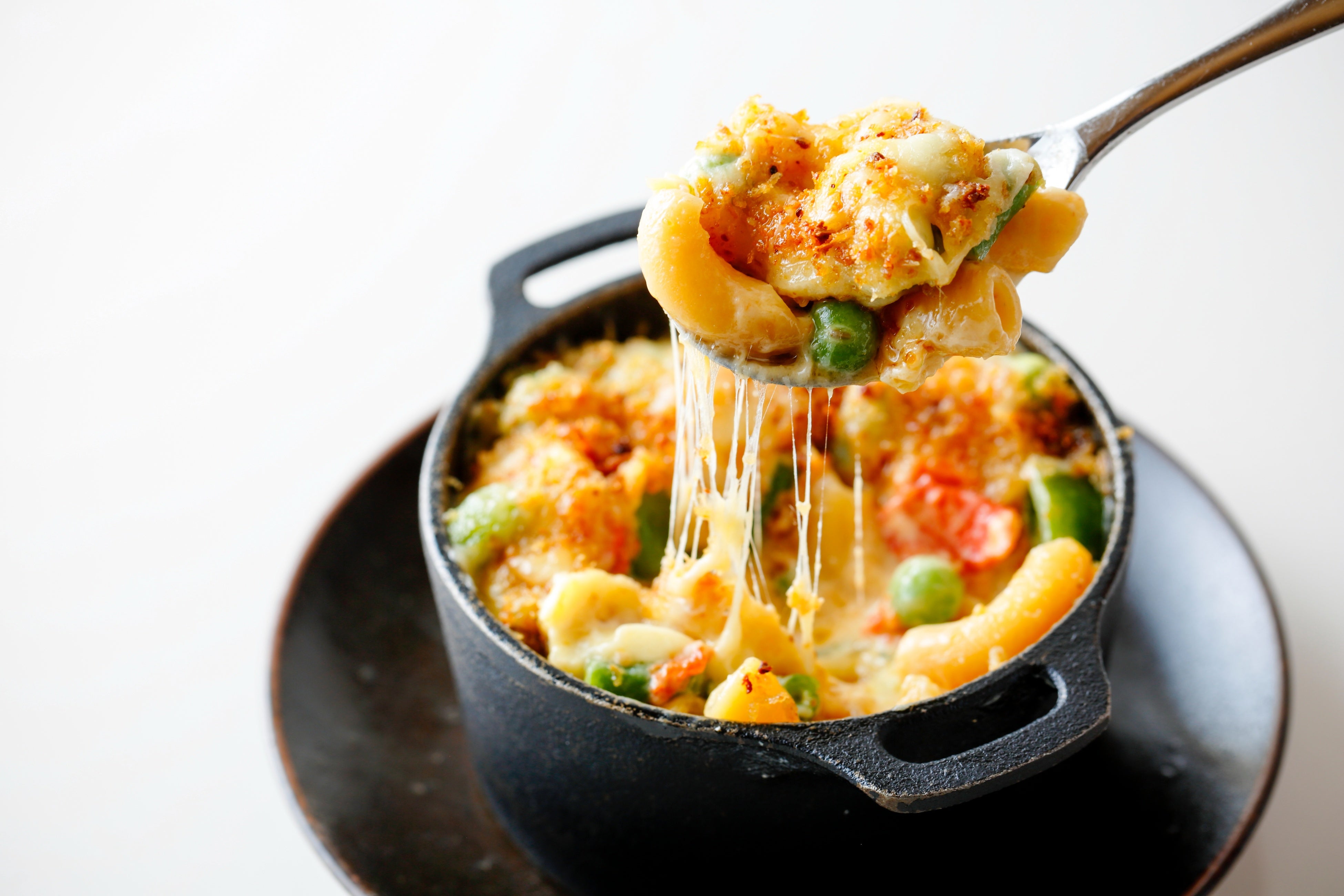 モチっとした食感がクセになる豆だけで作ったマメロ二。つなぎを使わず、うす皮もまるごと使った黄えんどう豆100%のマカロニと春の豆をチーズたっぷりのクリームソースと合わせたグラタンです。春の豆の香りや食感を楽しみつつ、グリルしたお魚やお肉のサイドディッシュとしても召し上がるのもおすすめです。