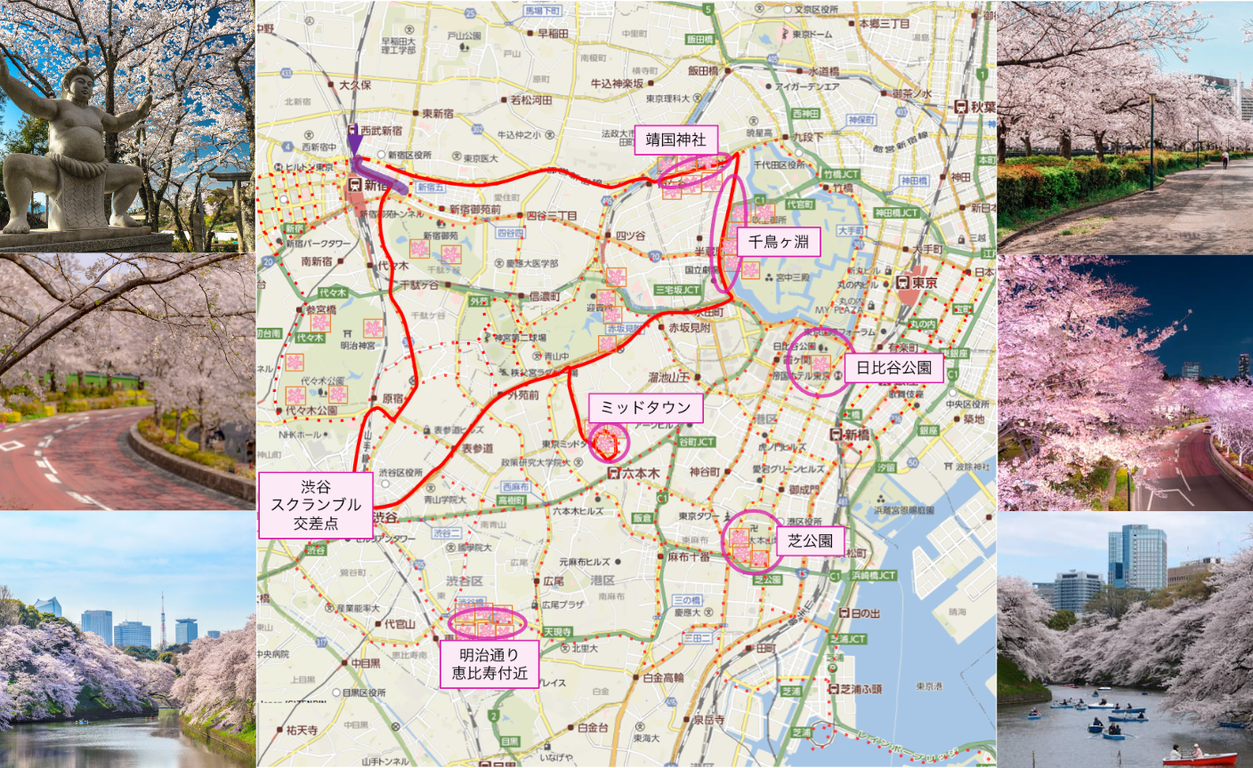 コース:新宿→渋谷→ミッドタウン→千鳥ケ淵→靖国神社→新宿 ※桜スポット3箇所