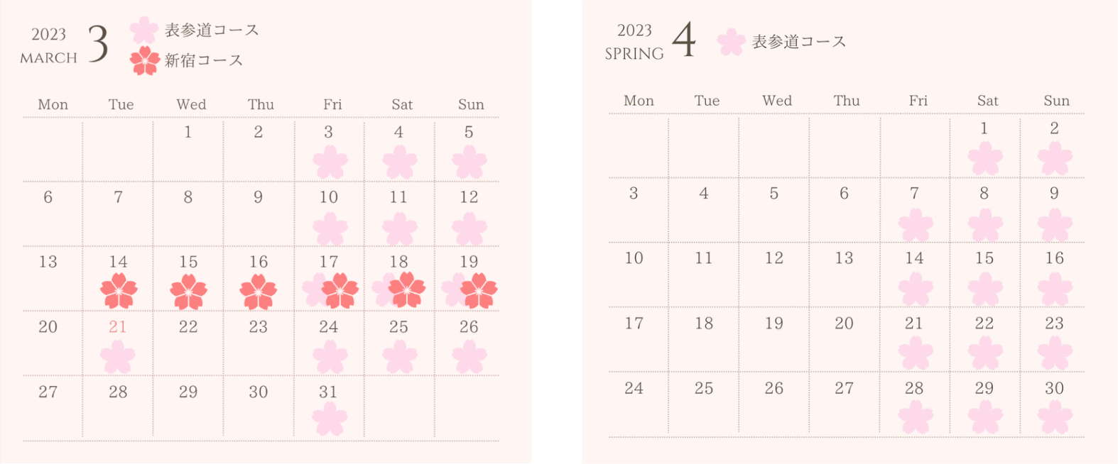 表参道コース:4/1~2、7~9、14~16、21~23、28~30