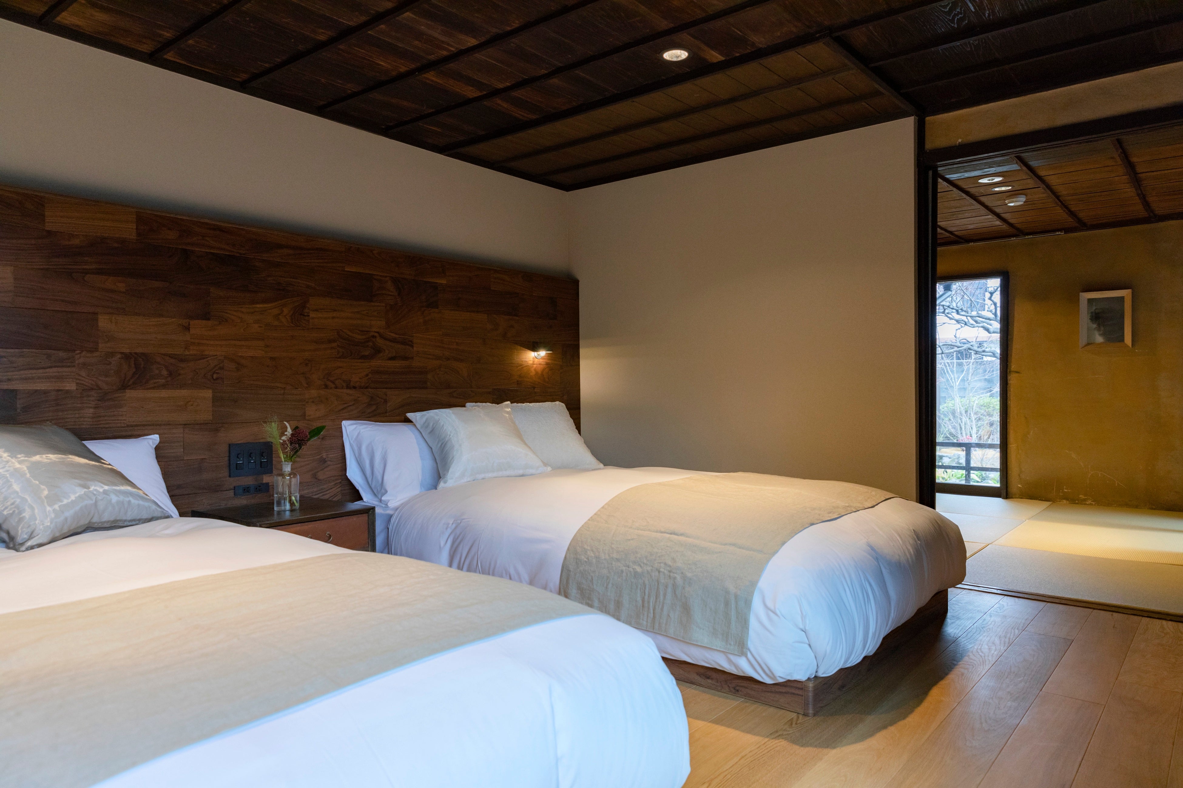 湧き水が流れる水路がある庭「湧水庭」を最大限活かし、この庭に面するよう、客室2室のみを設けました。雲仙岳と有明海に囲まれた自然豊かな島原。ここは至る所から、こんこんと湧き出る清らかな島原湧水群があることから水の都とも称されます。この島原の資源そのものである湧き水を贅沢に感じつつ、ゆったりと滞在できる空間です。また2室のうち、1室は玄関を入ってすぐの部屋に、キリスト教徒ではないことを示すために当時作られた仏壇跡があり、この土地の隠れキリシタンの歴史を感じさせる痕跡が今も残っています。2室とも浴室には島原温泉を完備しています。
