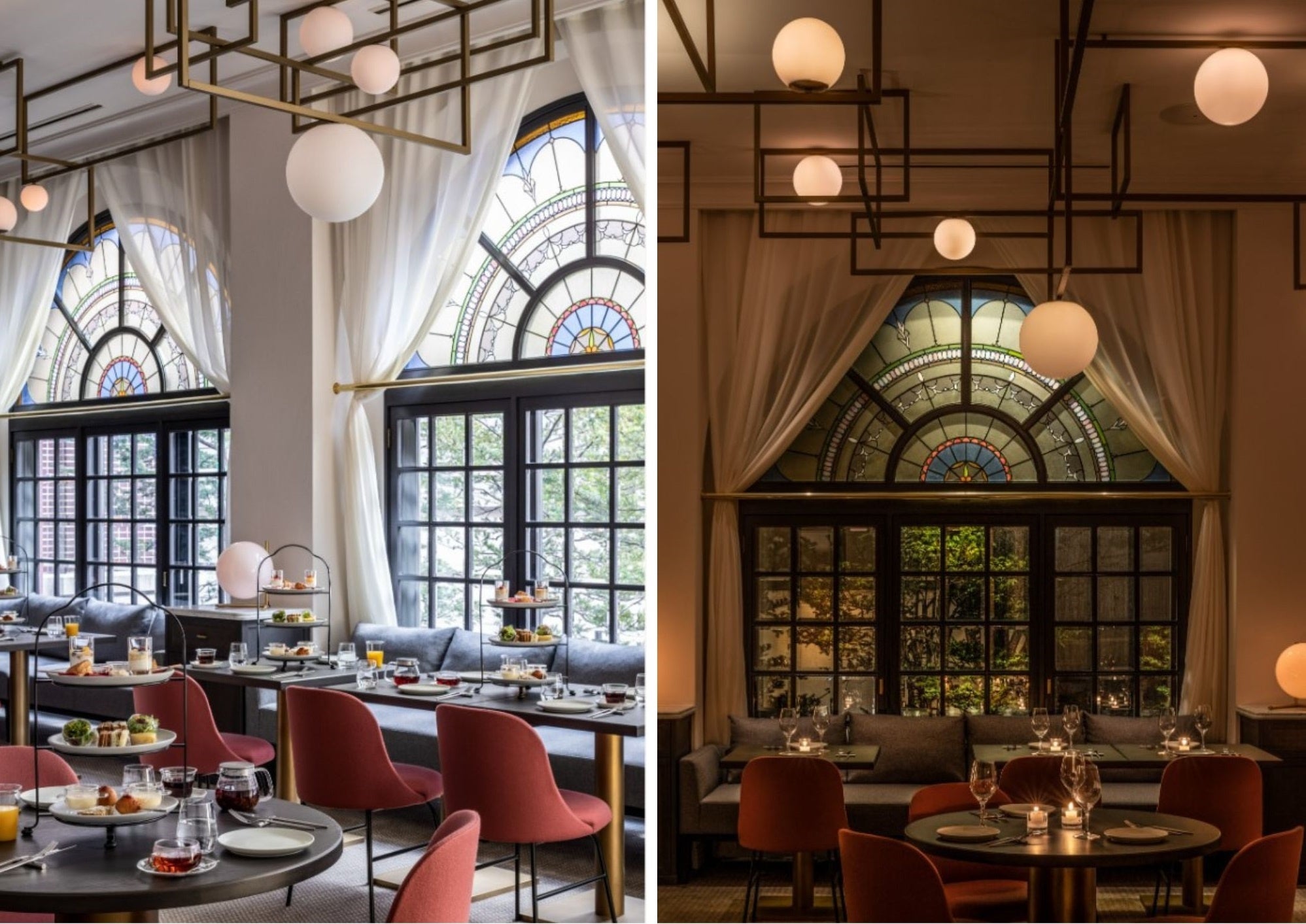 ゲストの特別なひと時に寄り添う空間を提供しているUNWIND HOTEL&BAR 小樽のメイン会場。90年以上残る建築当時のステンドグラスはそのままに、3.7mの高い天井を活かしたライティングを施し、当ホテルで最もクラシックとコンテンポラリーの融合を感じられる空間です。日中は大きなステンドグラスの窓からキラキラと注ぐ太陽の光が心地よく、夜は球体の照明が浮かんで見える幻想的な空間を演出いたします。