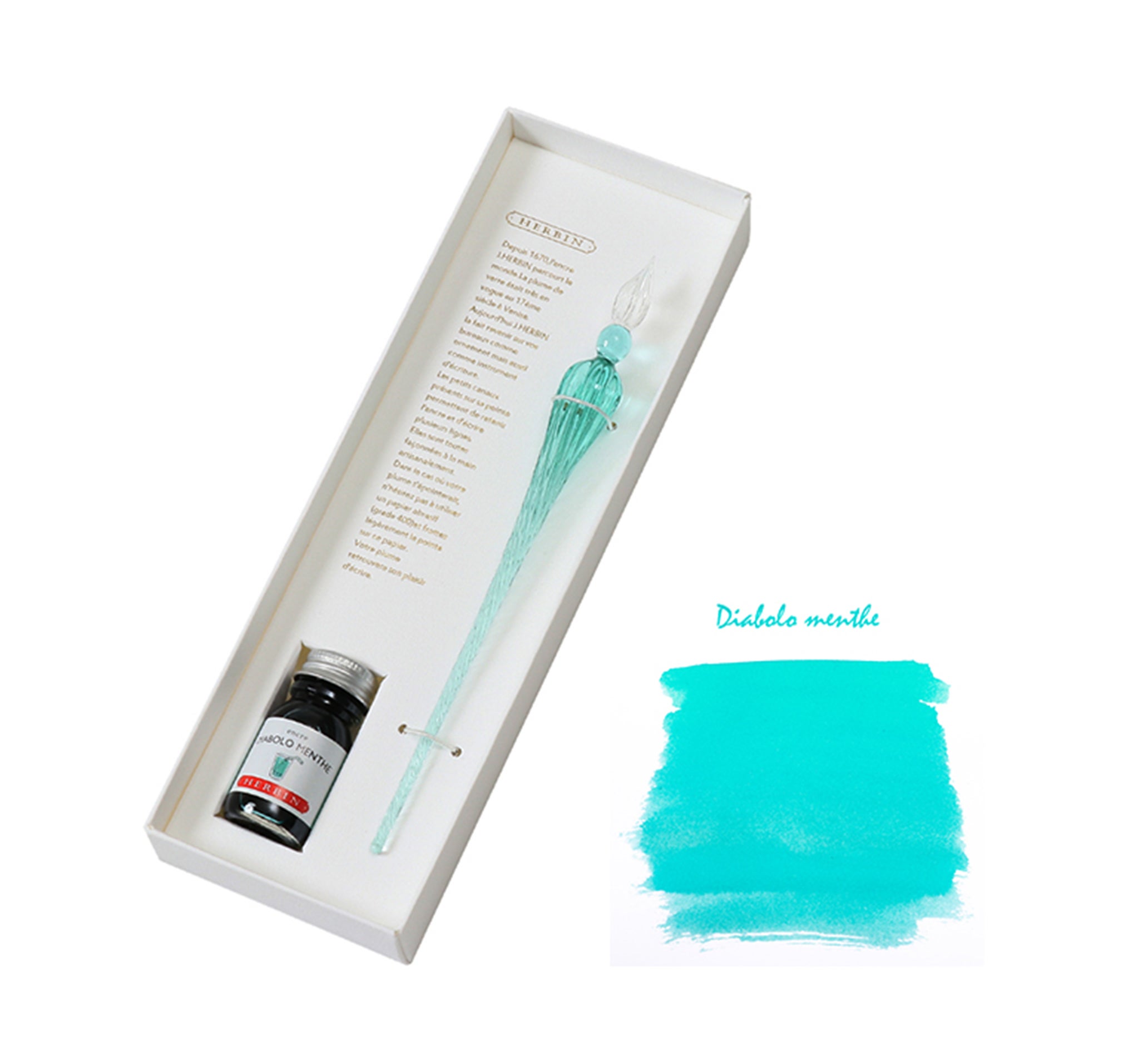 美しいフォルムのガラスペン「つむぎ」とインク付。ペン先部分に施された細かな溝により、インク切れなく文字を書くことができます。文豪気分で手紙や小説を書いてみてはいかがでしょうか。