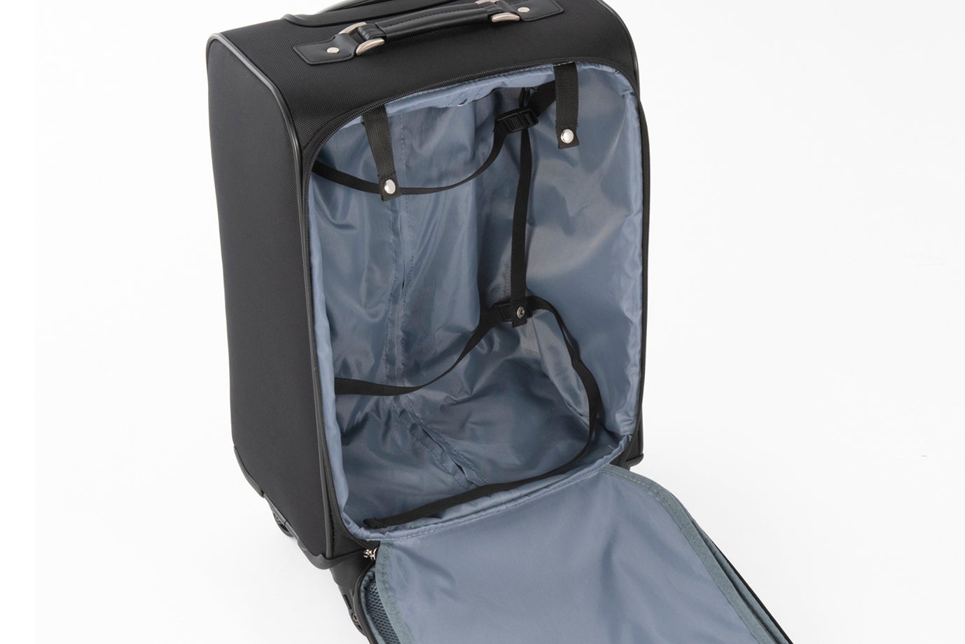 メイン収納部はキャリーを立てたまま開閉でき、内装には荷崩れを防止するベルトや、目隠しになる仕切りが付いているので、移動中も安心して荷物を出し入れできます。