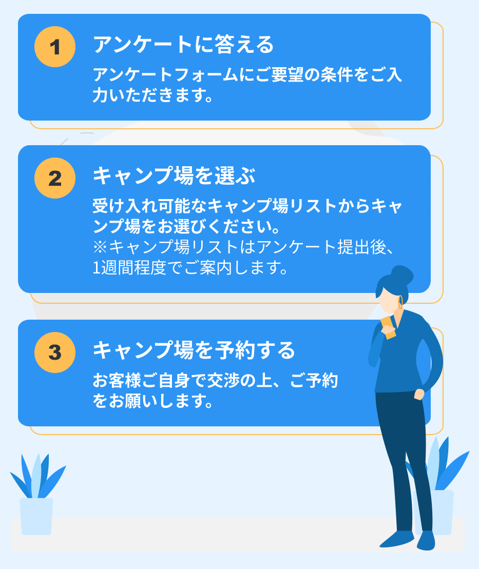 『なっぷ』の団体マッチングサービスに参画いただいているキャンプ場のなかから、お客様のご要望にあわせてご提案します。アンケートに頂いた「空き状況」「人数・規模」などの条件から抽出された会場をお取次ぎまでをサポートさせていただきます。