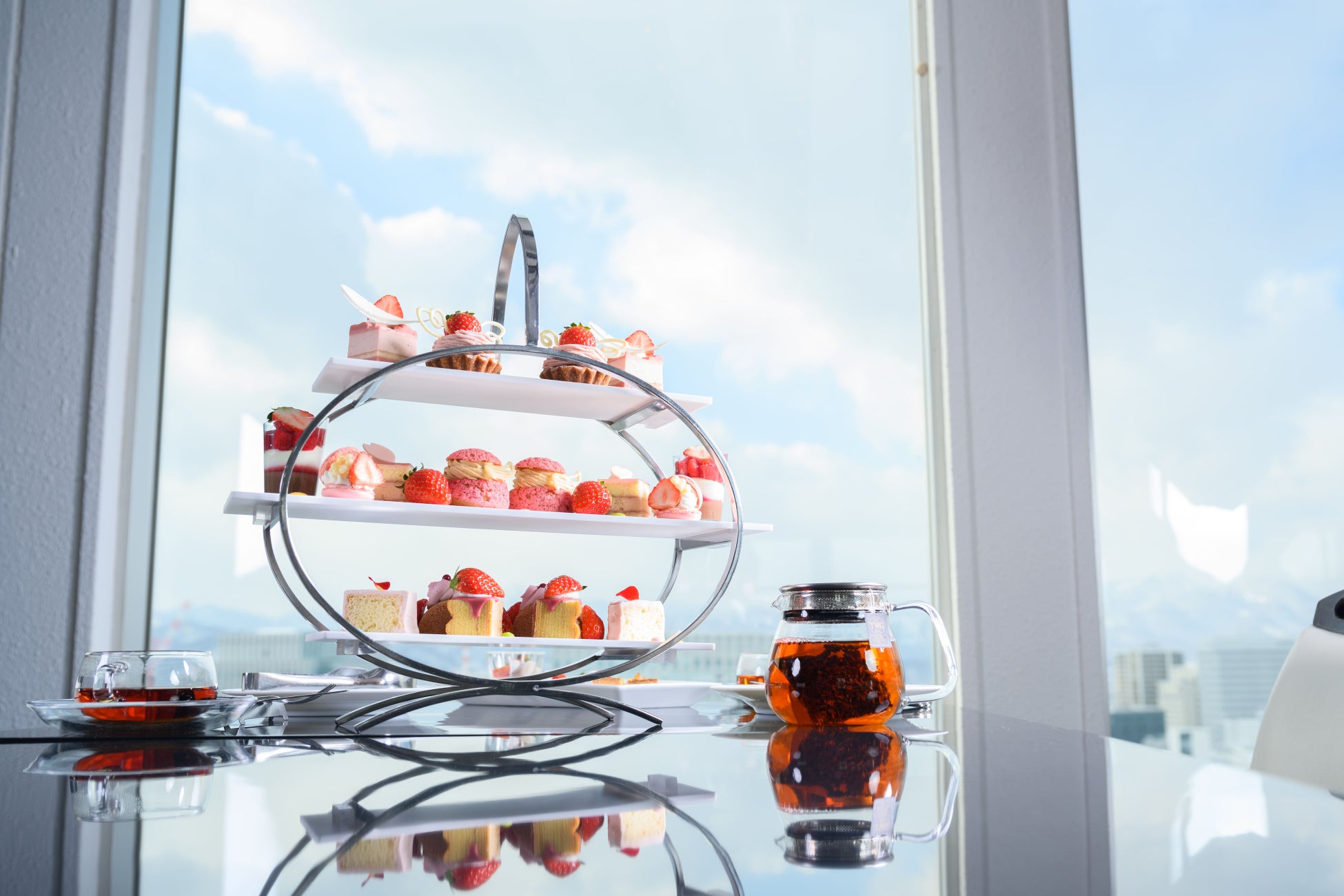 滞在時間は最大150分。最上階26階からの素晴らしい景色を眺めながら、いちごを贅沢にアレンジしたスイーツとプレミアムティーを心ゆくまでお楽しみください。