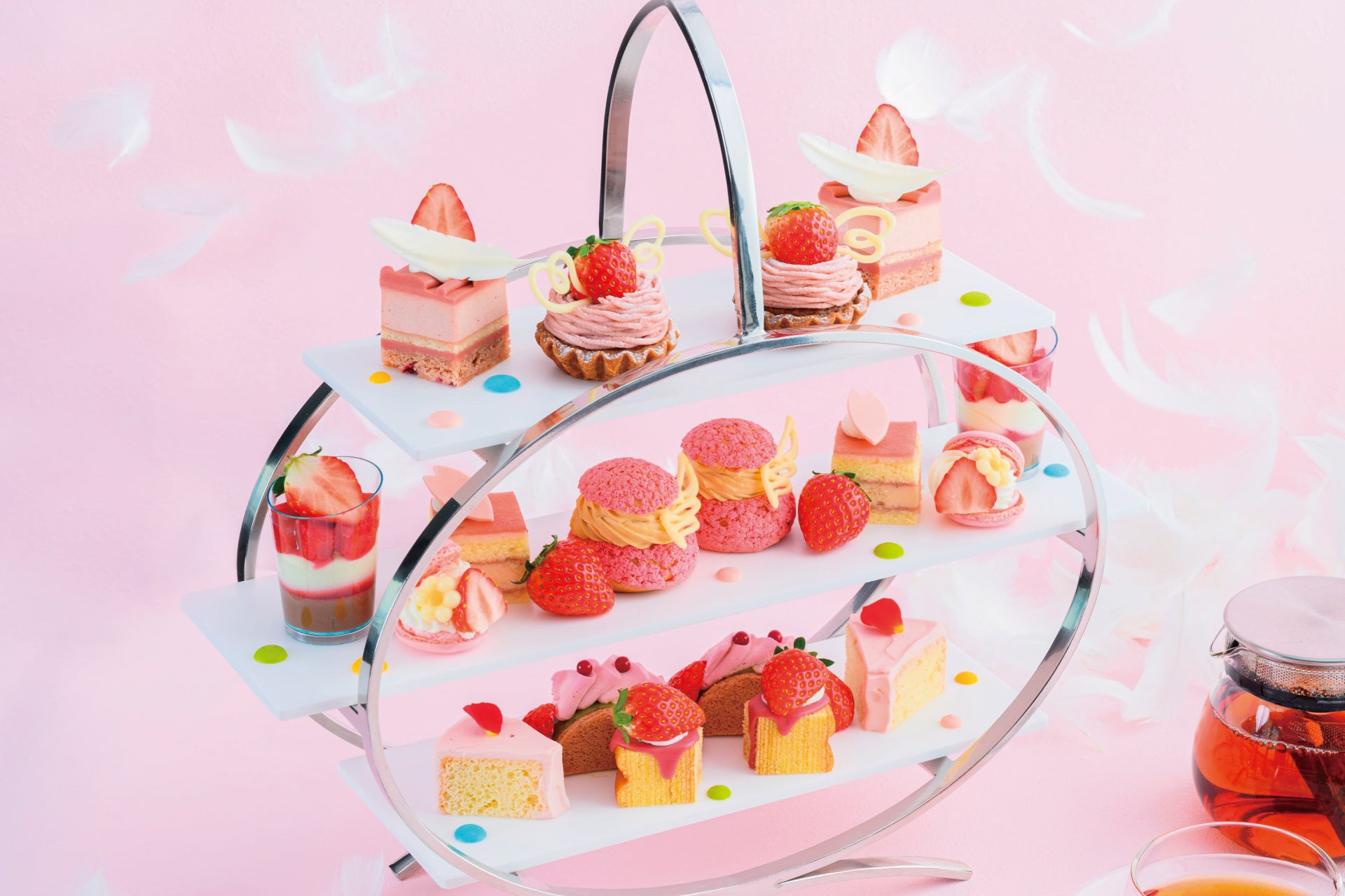 まずは、テーブルに運ばれるいちごのウェルカムドリンクをお楽しみください。パレットに見立てたティースタンドを、パステルカラーでキュートないちごスイーツで埋め尽くします。旬を迎えるいちごと組み合わせたのはバラやローズマリー、桜などの春の香り。希望に満ち溢れた春の空と飛び立つ翼を9種類のスイーツたちで表現しました。