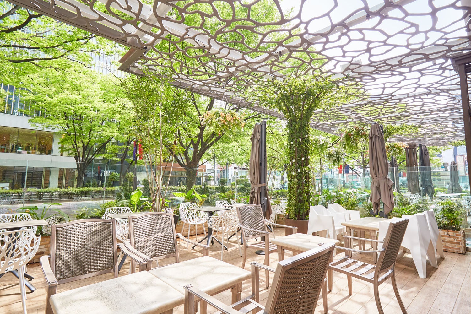 表参道のケヤキ並木から続くロビーに、緑の木洩れ陽が差し込むテラス。