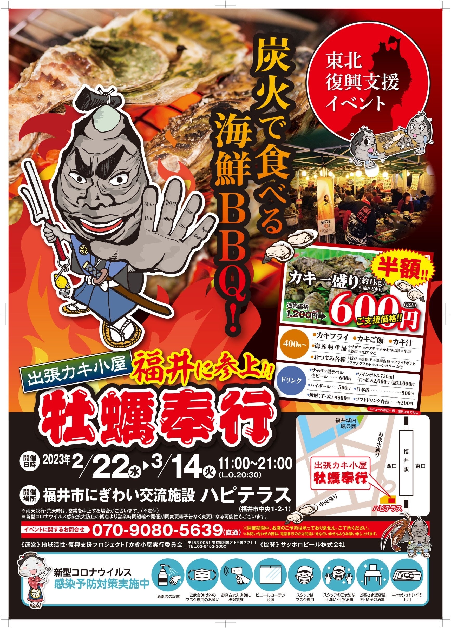 「出張カキ小屋 牡蠣奉行が今年も福井駅前特設会場に期間限定オープン。期間は2月22日〜3月14日まで。
