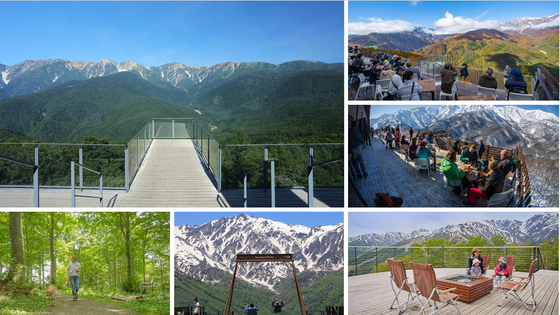 ゴンドラリフト1本でアクセスできる山頂エリアからは北アルプスのパノラマ風景や白馬村の街並みなどを360度望むことができます。四季折々、天候や時間帯によって移りゆく絶景は、非日常的な時間の過ごし方を提供します。この眺望の良さを活かして、2018年オープンの絶景テラス&カフェ「HAKUBA MOUNTAIN HARBOR」を皮切りに、絶景大型ブランコ「ヤッホー!スウィング presented by にゃんこ大戦争」(2020年)や山頂フェス「アルペンアウトドアーズ プレゼンツ『HAKUBAヤッホー!FESTIVAL』」の開催(2020年〜)、新展望エリア「白馬ヒトトキノモリ」のグランドオープン(2022年)など、毎年さまざまな取り組みを実施してきました。