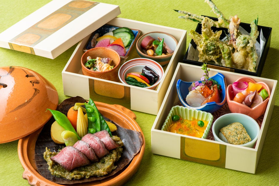 「能登牛の陶板焼き御膳 春彩てまり」は、きめ細やかな肉質で芳醇な旨味と香りが特徴の「能登牛」とほろ苦い「ふきのとう味噌」が好相性な春の御膳。季節の小鉢やお造り、春野菜の天婦羅、加賀味噌の味噌汁なども付いたお得な内容です。金沢金箔をあしらった古代箔のお重でお花見気分を満喫してください。