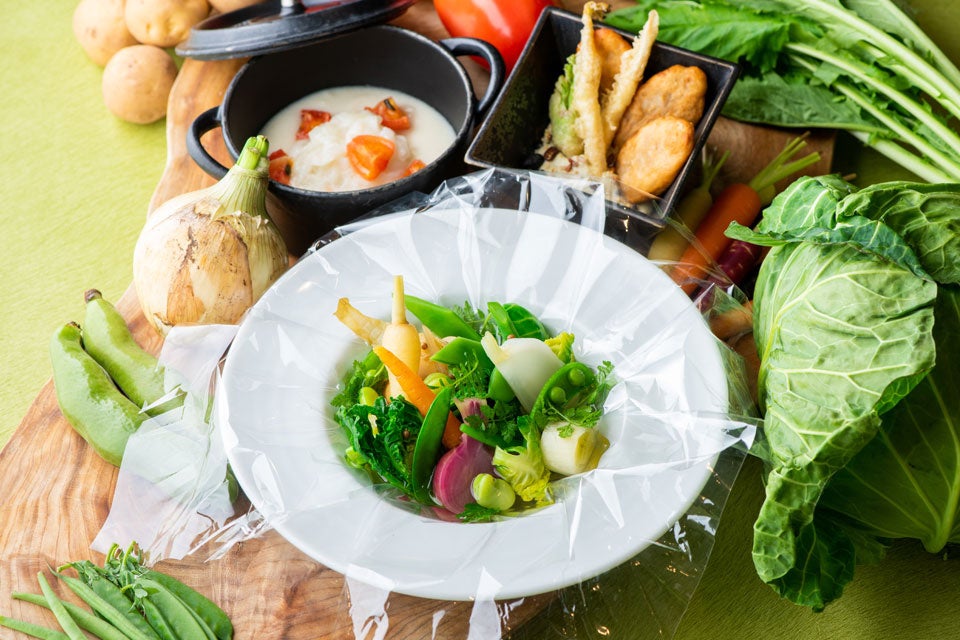 「52品目いしかわの菜園 サンカンドゥ ~春の里山の大地に育った野菜達~」は第20回東急ホテルズ料理コンテストで特別賞を受賞した滝川遼太が考案し、好評をいただいている“いしかわの菜園シリーズ”です。四季に合わせて旬の食材を一番おいしい調理法で仕立てた、健康を意識したメニューで、動物性食品を一切使用せず、能登の根菜や山菜、新玉葱、新じゃがいも、加賀丸芋、春キャベツ、加賀蓮根など石川で育った野菜が豊富でヘルシーな内容となっております。耐熱フィルムで包んで蒸し上げた野菜は栄養素も豊富で滋味深い味わいです。白山麓の里山をイメージした春の味覚をお楽しみください。