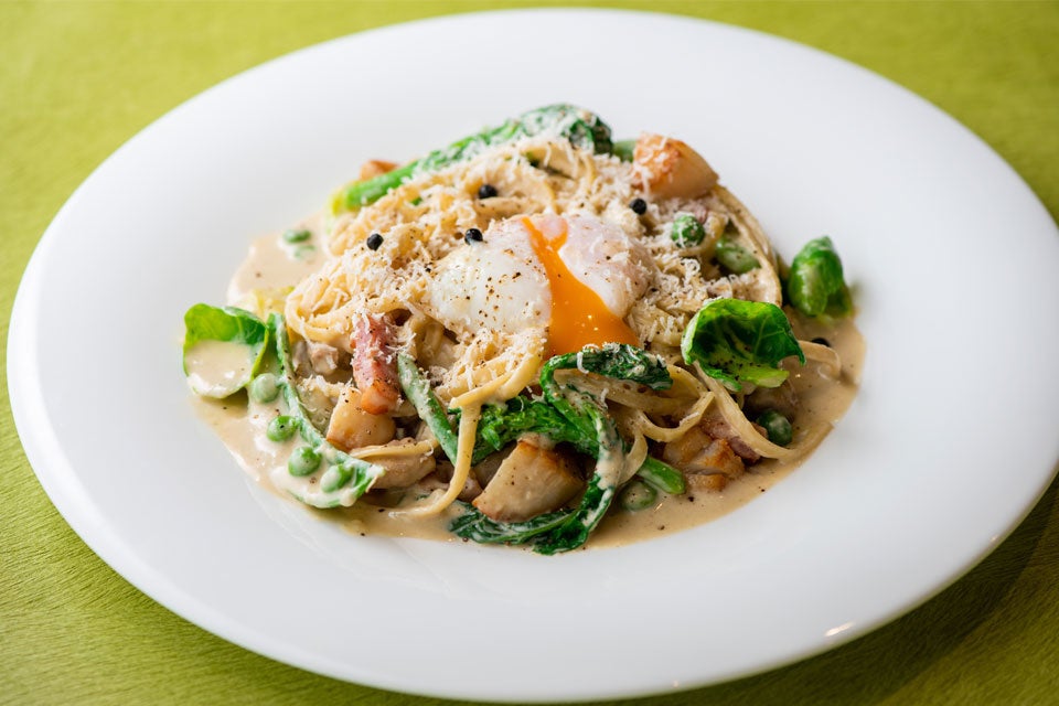 「帆立貝と春野菜のカルボナーラ」は自家製パンチェッタと能登豚ベーコンで旨味と風味を引き出し、じっくりと炒めた新玉葱の甘さを活かしたクリームソースで仕上げました。旬の蛍烏賊やアスパラガスを添えて提供いたします。