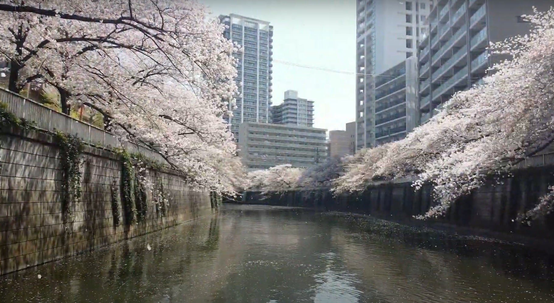※東京の人気お花見スポット目黒川の桜並木、船から桜を見上げるフォトジェニックな景色