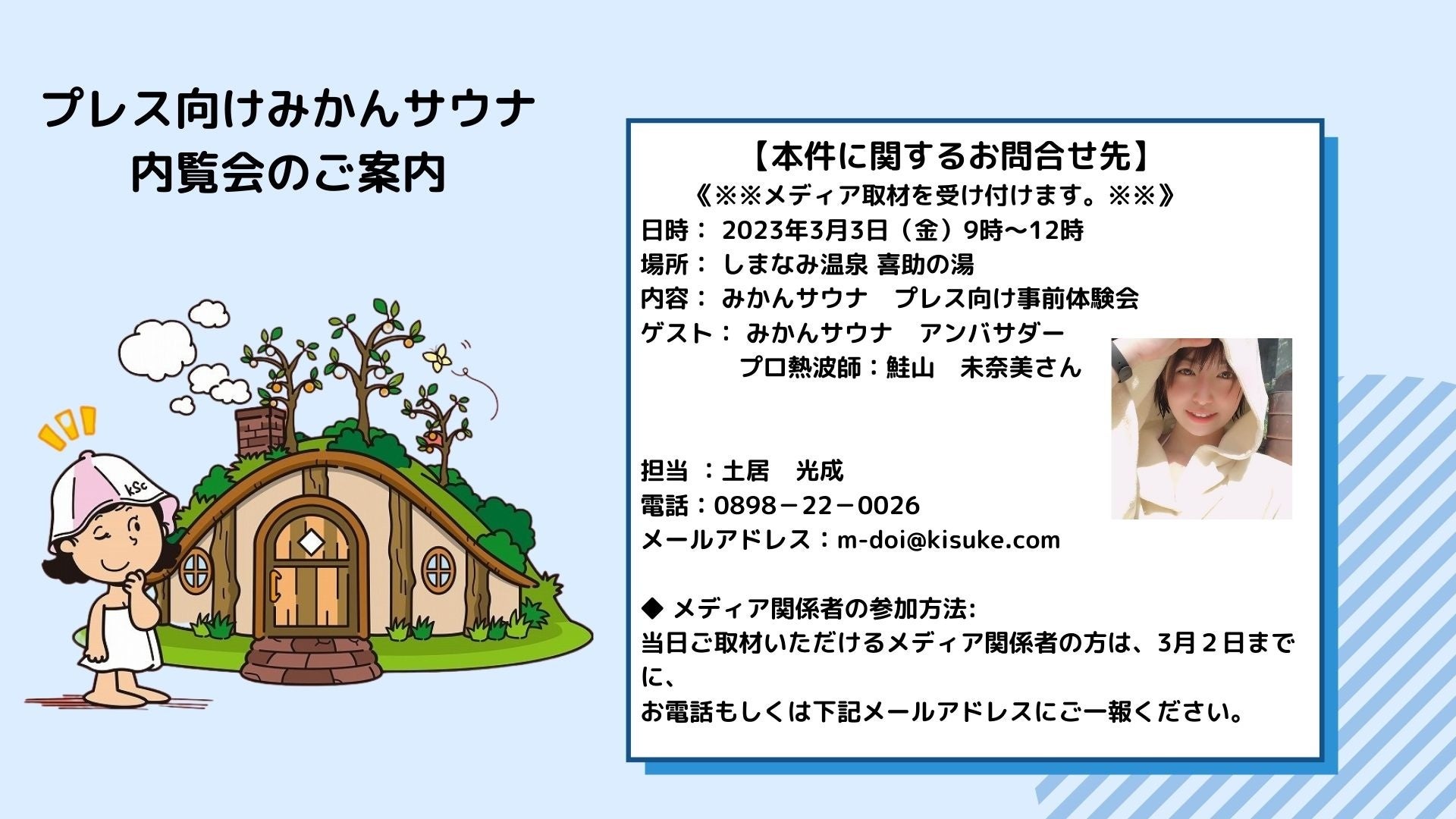 愛媛県で温浴施設「喜助の湯」を展開する総合エンターテイメント企業・キスケ株式会社(本社:愛媛県松山市、代表:山路義則)が、「しまなみ温泉 喜助の湯」(愛媛県今治市)に、3月4日(土)にオープンする愛媛の魅力が詰まった「みかんサウナ」の公式アンバサダーに、プロ熱波師の「鮭山未菜美」さんが就任しました。