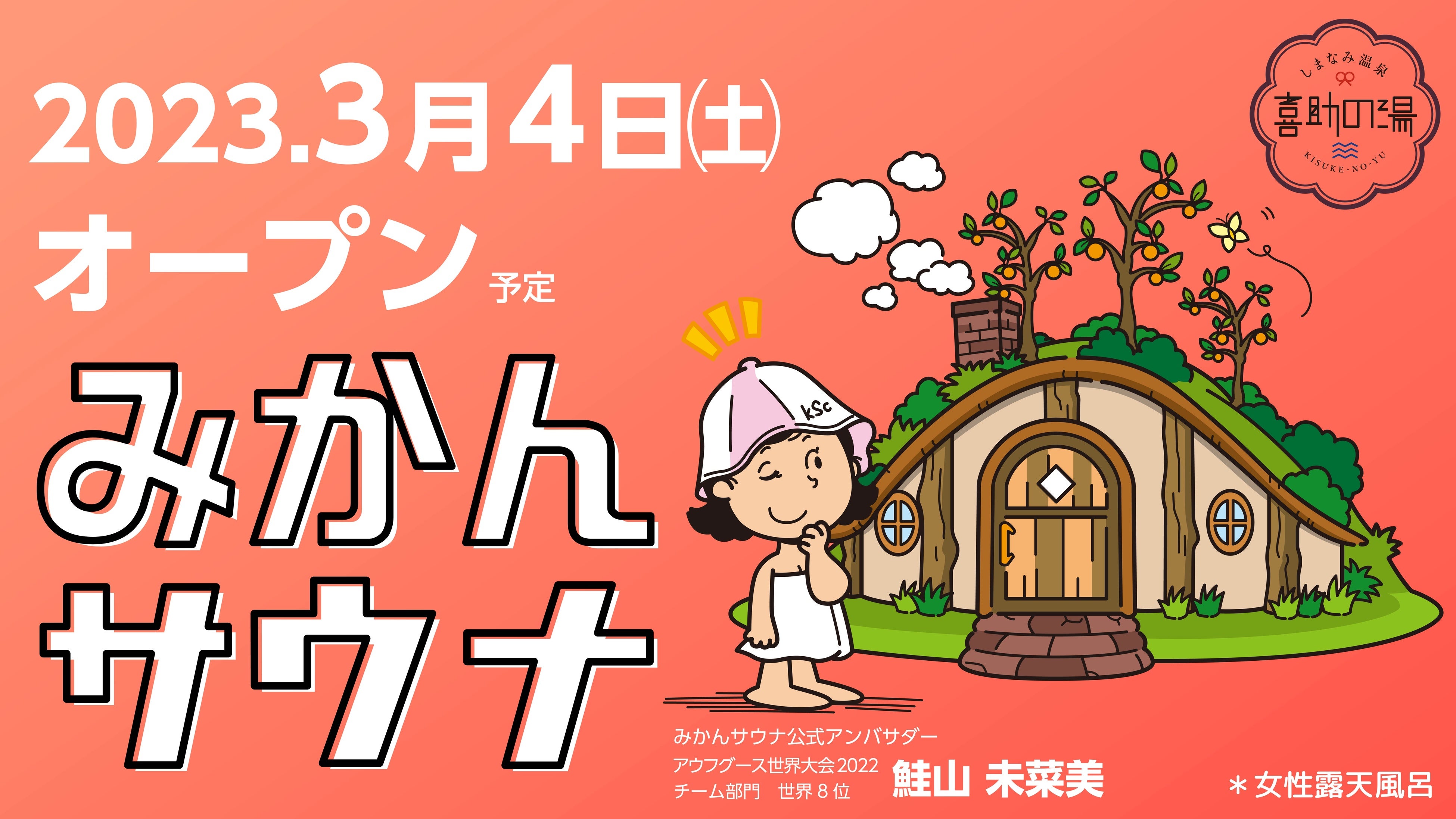 2023年3月4日(土)、これまで数々の魅力的なサウナ開発・サウナイベントを展開してきたkScのプロデュースにより、「みかんサウナ」が「しまなみ温泉 喜助の湯」に登場予定! 「みかんサウナ」は、サウナ室内にみかんのアロマを使用し、香りを楽しみながら入浴できます。