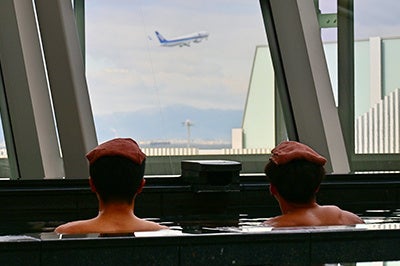 くつろぎ処は、展望風呂「SOLA SPA 風の湯」、韓国料理・和食レストラン「お食事処 えびす」、アジアンスパ「SANATIO SPA」をお楽しみいただける総合リラクゼーション施設です。「SOLA SPA 風の湯」は、日本初の飛行機を望める展望風呂。伊勢湾に沈む夕日や、飛行機の離着陸をみることができます。入浴後は隣接している韓国料理・和食レストラン「お食事処 えびす」でお食事、お飲物をお楽しみいただけます。