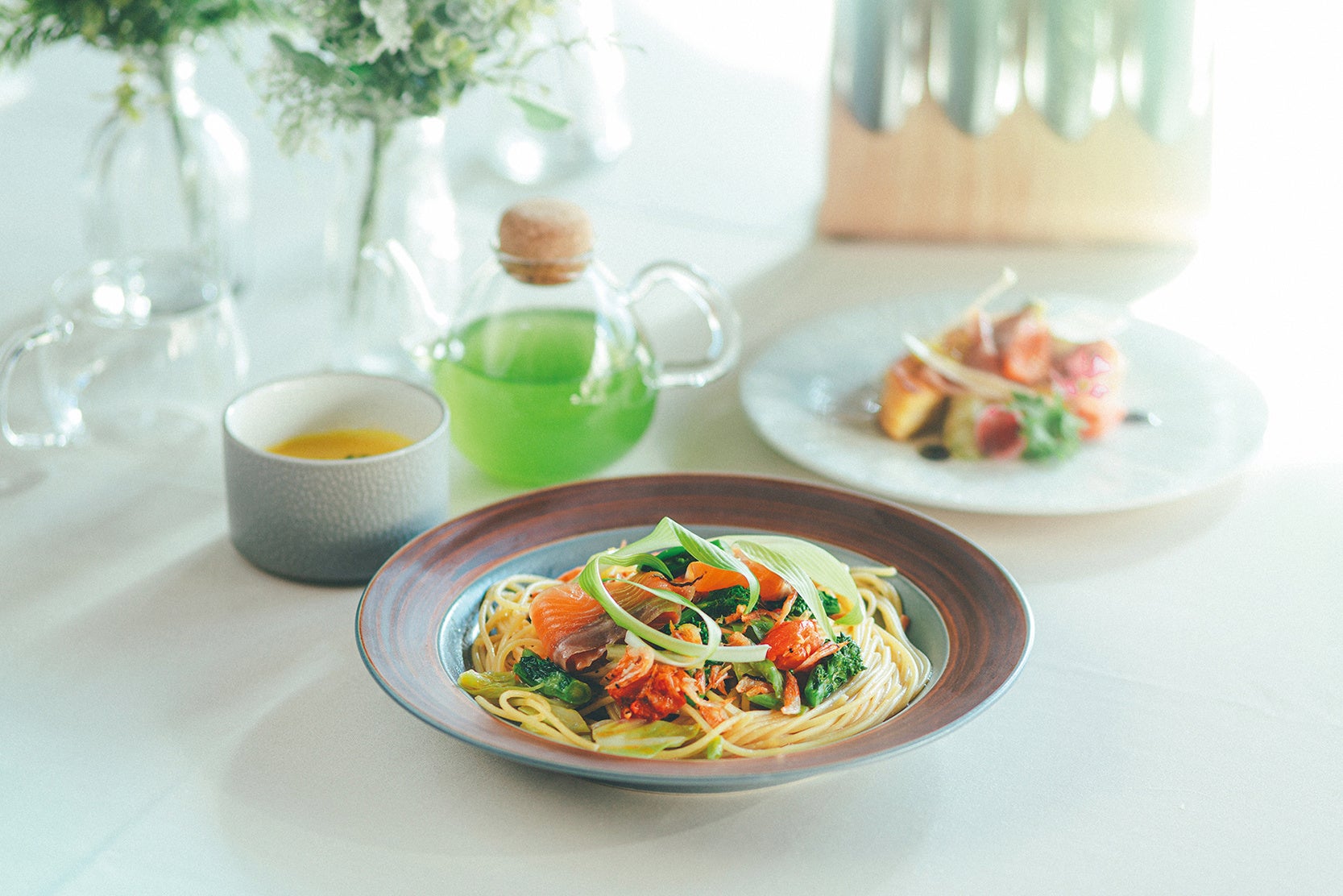 桜海老と春野菜のパスタ タスマニアサーモンのマリネ添え