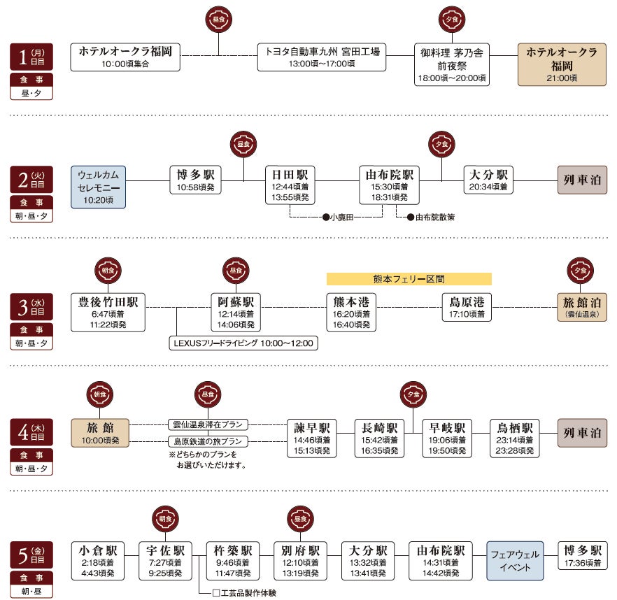 初日は福岡市内(ホテルオークラ福岡)集合、最終日は博多駅 17:36頃 解散予定
