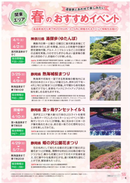このたび、2023年 2月20日発行のゆこゆこ4月号から「季節のおすすめイベント特集」ページが新登場。新たな取り組みとして、当社の営業社員が培ってきた観光協会や宿泊施設との関係性を生かし、直接会話し声を聞くことで得たイベント情報をご紹介します。今ならではのイベントや、宿周辺情報を開催時期や見どころと合わせてわかりやすく紹介し、お客様の“いま行きたい”を後押しするコンテンツとなることを目指します。(一例:神奈川県 湯探歩(ゆたんぽ) など)