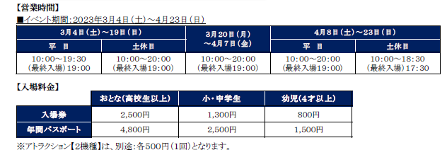 | ■開催時間(各回約15分間) 【3月4日(土)~4月7日(金)】19:00 【4月10日(月)~14日(金)および、17日(月)~21日(金)】19:00 ※4月8日(土)・9日(日)・15日(土)・16日(日)・22日(土)・23日(日)は実施いたしません。 |