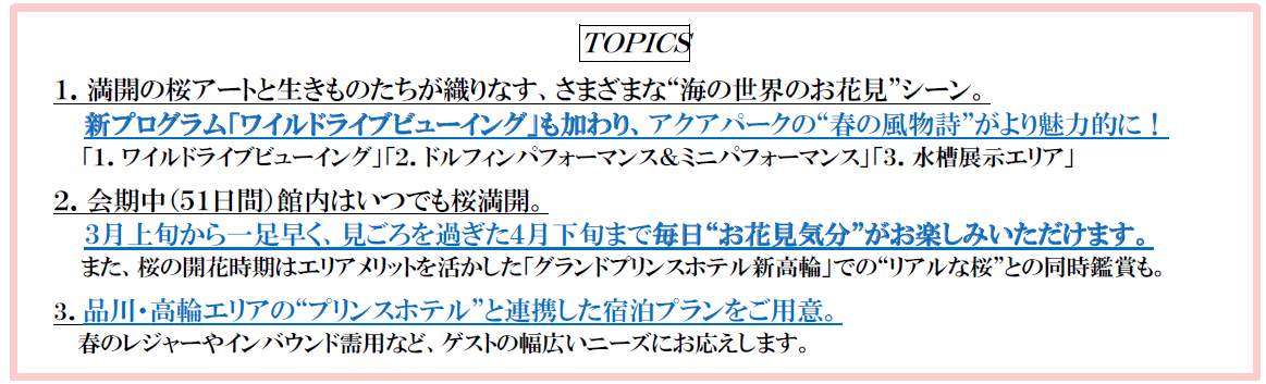 例年、桜を楽しむための多彩な“お花見スタイル”が登場する中、当館は【生きもの×デジタルテクノロジー】という施設特長を活かし、日本が誇る春の情景と海の世界が織りなすオリジナリティあふれる空間・コンテンツで非日常のひとときをお届けします。さらに、会期中(51日間)館内はいつでも桜満開。3月上旬から“一足早いお花見気分”に浸れ、開花時期には高輪エリアに咲く“リアルな桜”との同時鑑賞が可能、見ごろを過ぎた4月下旬までお花見がお楽しみいただけます。また、屋内型のハードは天候や気温、花粉などの影響を受けることなく常時快適にお過ごしいただけ、『品川プリンスホテル』内に位置する水族館として、品川・高輪エリアのプリンスホテルとの宿泊プランもご用意しました。
