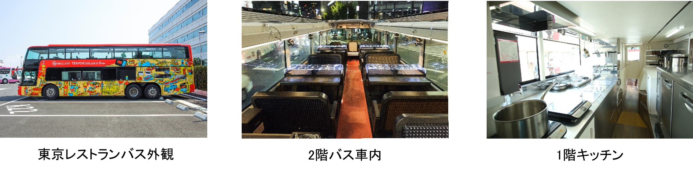 移動と食の融合により新たな感動体験を提供する「レストランバス」は、1階にキッチン、2階には対面式の座席とテーブルを備え、透明で開閉可能なオープンルーフは開放感があり、いつもと違う目線から眺める景色と、本格的な料理をお楽しみいただけます。東京レストランバスの外装は、東京らしさをイメージし、多数のビル群や観光名所を“食”と掛け合わせてポップなカラーリングでデザインしています。内装は、シックな色合いでまとめ、夜は調光可能なLEDと間接照明により、高級感あふれる落ち着いた空間になっています。