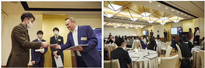プログラムの最終日である4日目には、大阪市北区に位置する「インターコンチネンタルホテル大阪」にて開催しました。まずは、日本MGMリゾーツ代表取締役社長CEOのエドワード・バウワーズよりウェルカムスピーチを行い、続いてインターコンチネンタルホテル大阪の総支配人のアレックス・ポーティアス氏による基調講演、その後、日本MGMリゾーツバイスプレジデント兼社長補佐 川上次郎とインターコンチネンタルホテル大阪の総支配人のアレックス・ポーティアス氏によるトークセッション、学生たちのグループワークプレゼンテーション、本プログラムの修了証授与記念式が行われました。学生は、大学の垣根を越えてグループワークに取り組み、大阪IRにどんなレストランをプロデュースするか、IRにおいてどのようにサステイナブルなMICE運営をするか、というテーマで準備したプレゼンテーションを発表しました。なお、本ネットワーキングイベントは、厚生労働省や大阪府のガイドラインに基づいた各種感染症対策を講じて実施しました。