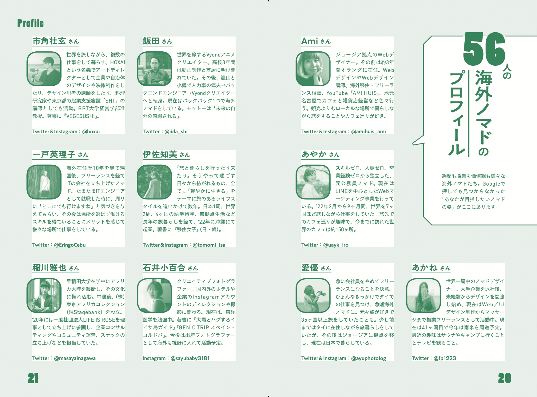 Kindle作家、会社役員、VFXプロデューサー、Webディレクター、YouTubeマーケター、アートディレクター、インフルエンサー、ビール職人、移住支援、ドローンパイロット、法人進出支援、マッサージ師、モデル、ラーメン職人、絵本作家、奇祭ハンター、採用支援、古着屋、カフェ経営、雑貨店経営、茶道家、料理研究家、書店員