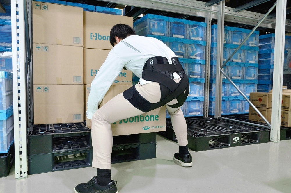 中腰姿勢や持ち上げ作業からくる腰の負担を軽減する、衣服のようなアシストスーツ。