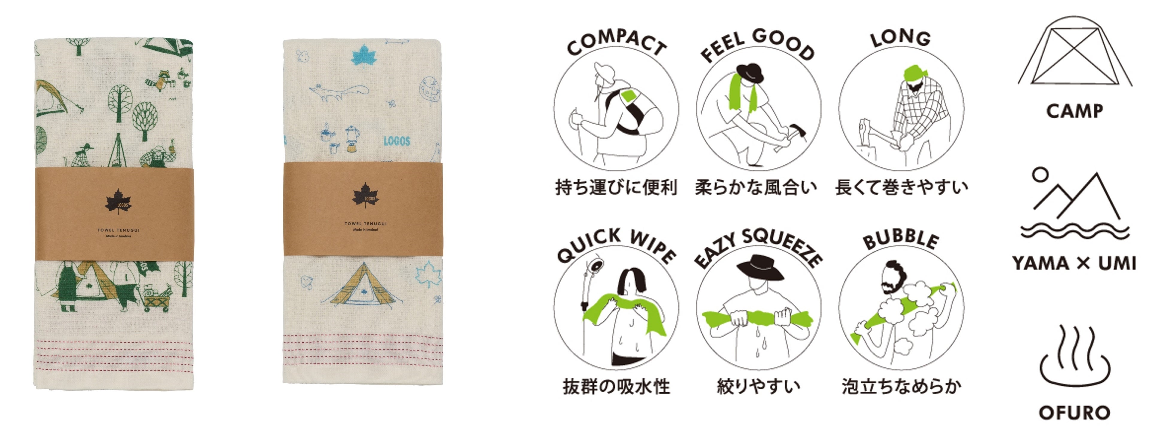 愛知県今治市で生産したLOGOSオリジナルデザインのタオルてぬぐい。吸水性・速乾性が高く、使い勝手抜群。