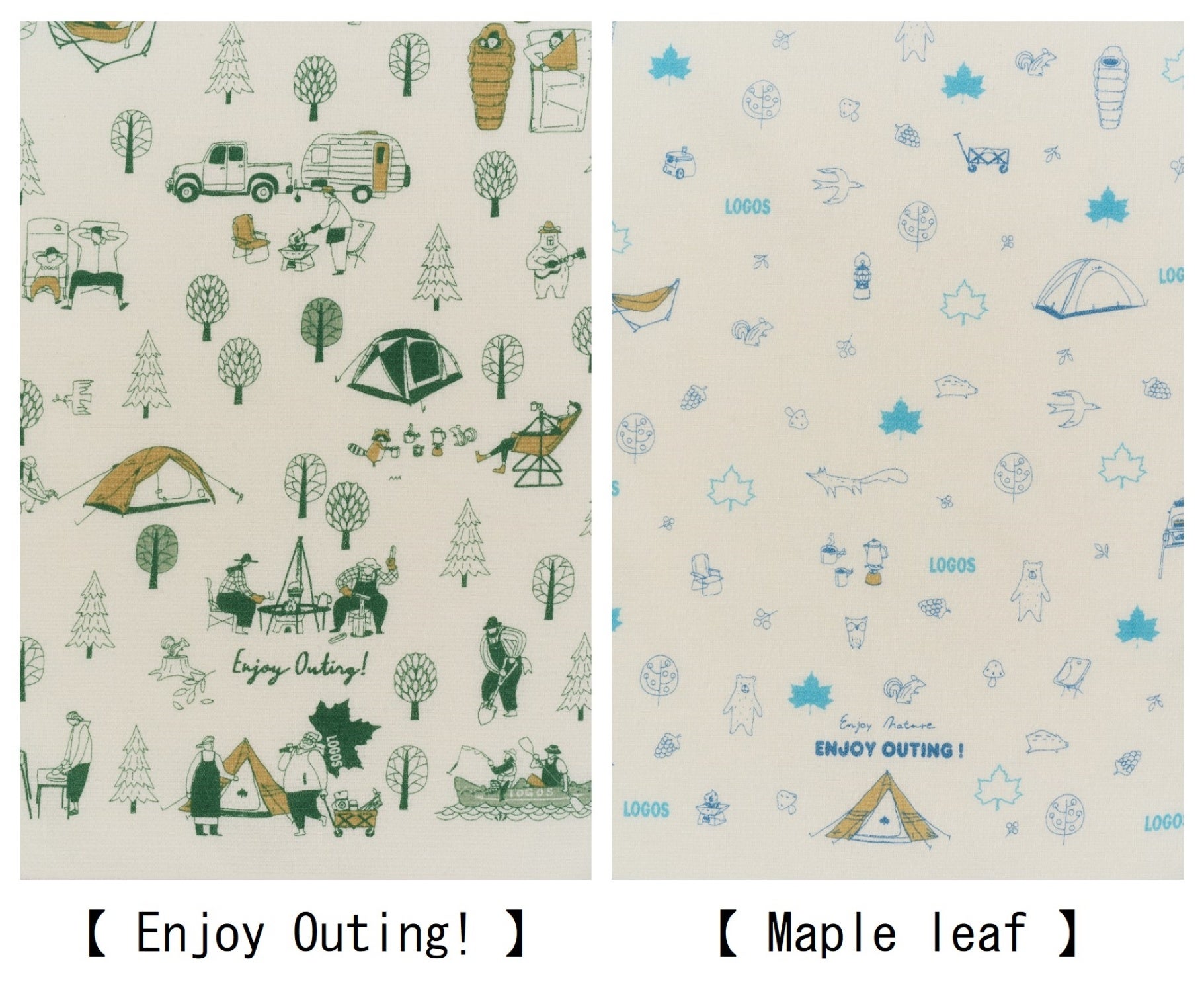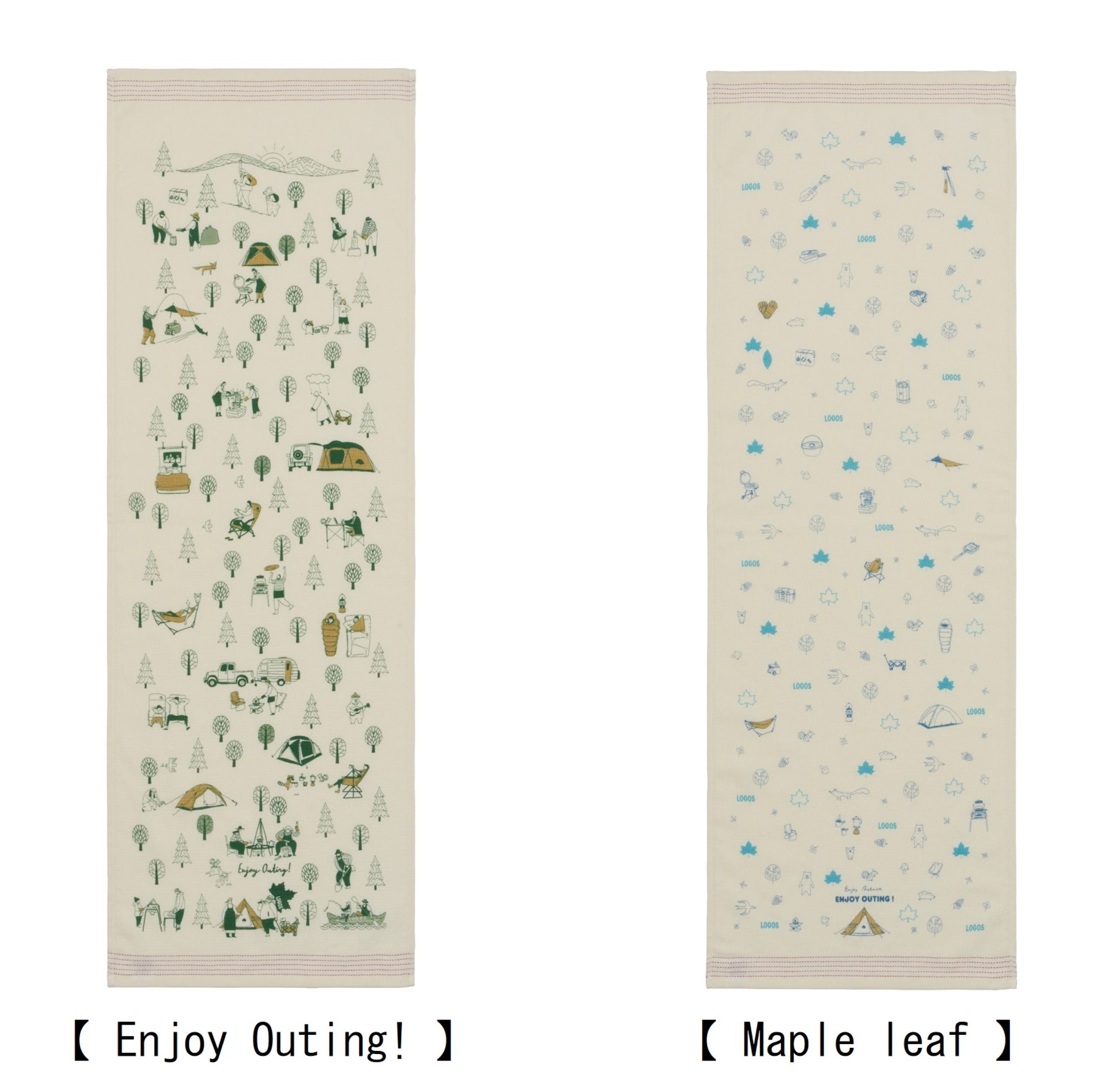 デザインは、LOGOSの合言葉をイメージして作られた「Enjoy Outing!」と、LOGOSのロゴであるメイプルリーフとアイテムを散りばめた「Maple Leaf」の2種を展開しており、洗い替え用として両方持っておくのもおすすめです。