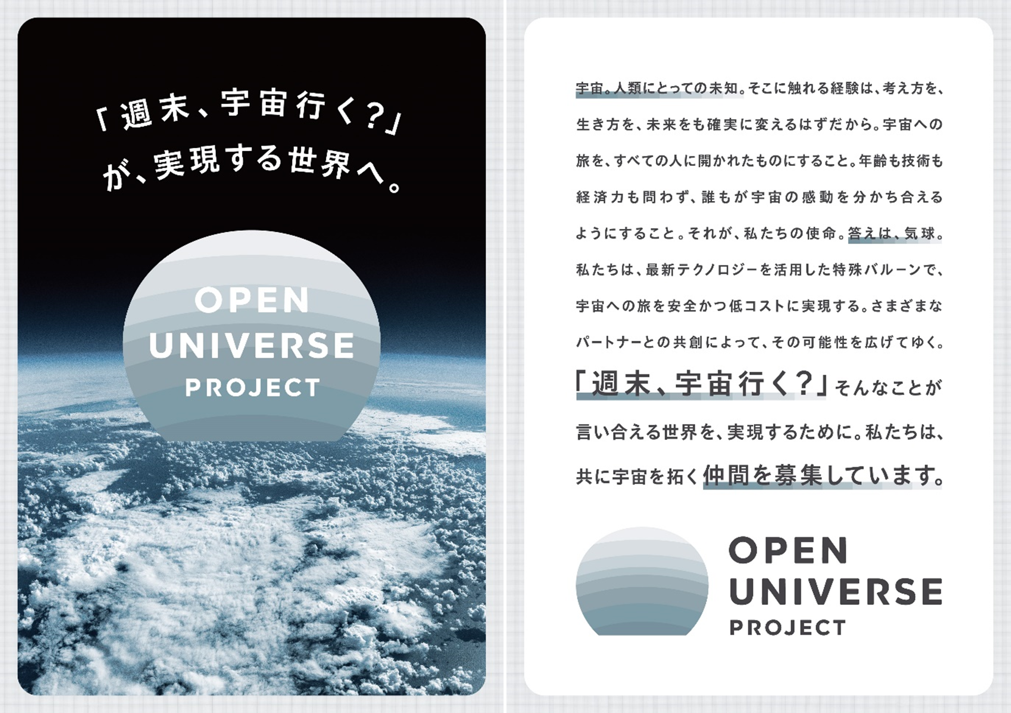 OPEN UNIVERSE PROJECTとは、気球によって“誰もがいける宇宙遊覧”を実現する岩谷技研のテクノロジーを軸に、様々な業種のパートナーとの共創によって日本から宇宙産業を開拓し、宇宙をすべての人にひらかれたものにしていく「宇宙の民主化」プロジェクトです。