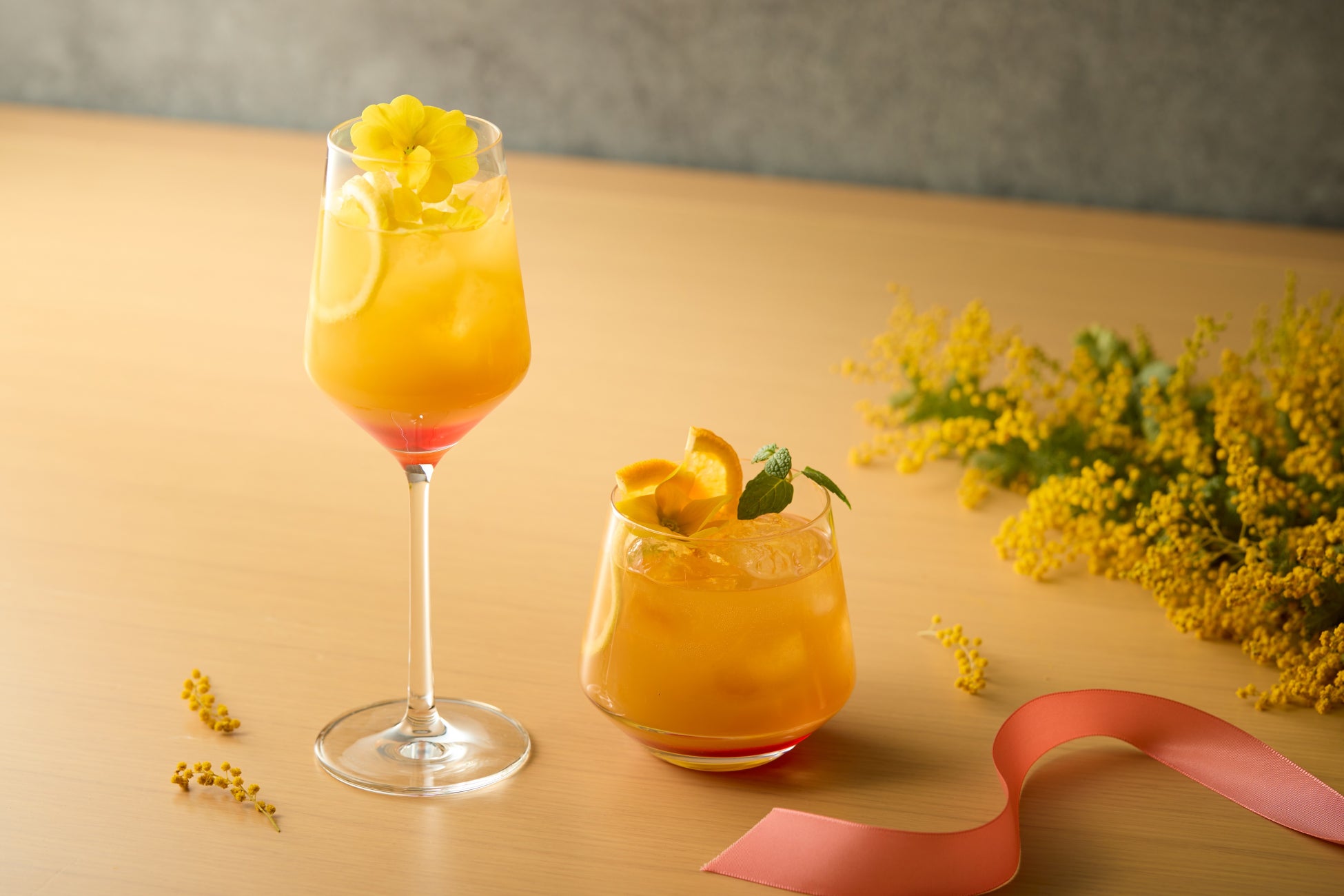 春の訪れを感じさせる桜のピンク色にミモザの黄色を重ね、一目でハッピーになれるような、はつらつとしたルックス。アプリコットをベースに、柑橘の爽やかなテイストを合わせ、桜シロップでほんのり春の香りを加えた、奥深い味わいを感じられるドリンクです。アルコールにはシャンパンを使用し華やかに仕上げました。ノンアルコールは、グレープフルーツジュースとノンアルコールスパークリングワインを使用し大人な味わいに。