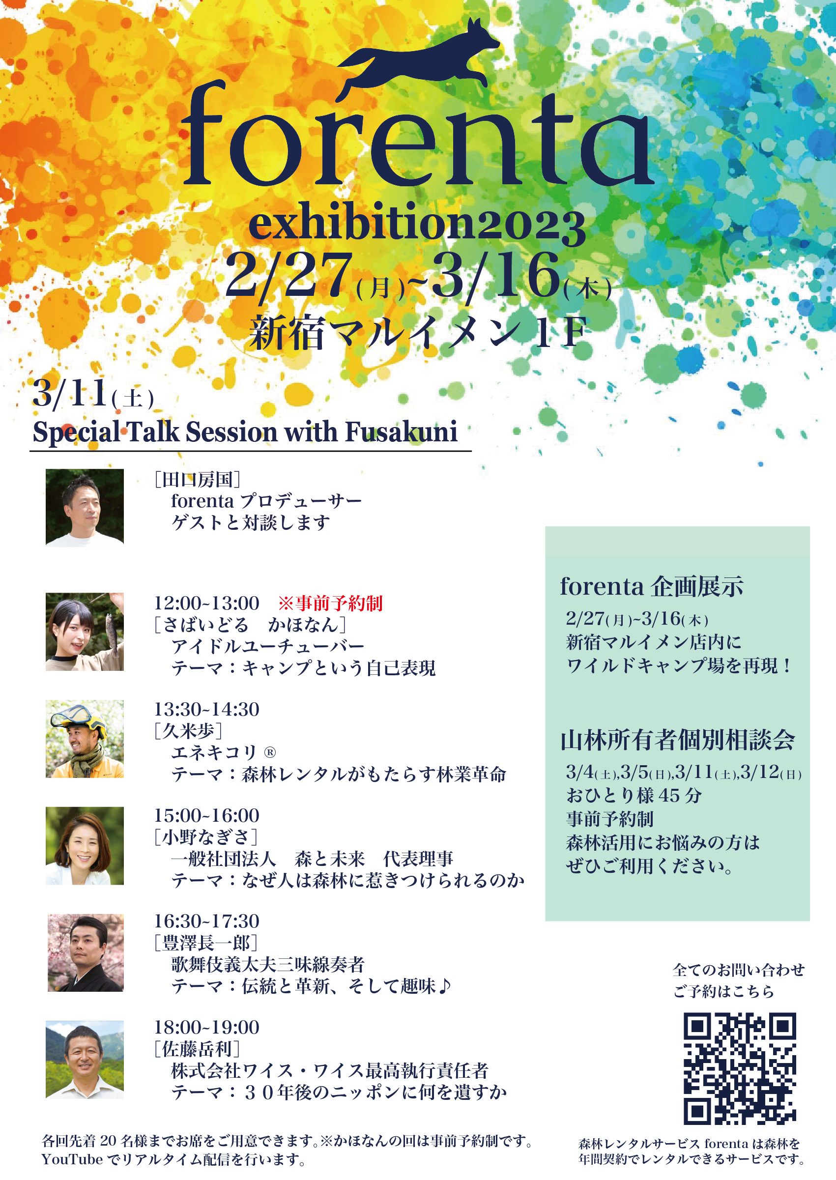 3月11日(土)に、キャンプや⾃然、森林活⽤をテーマにしたスペシャルトークセッションを開催します。「forenta」プロデューサーの⽥⼝ 房国が、いま⼀番話してみたい⼈をみずから選び、それぞれのテーマで対談を⾏います。