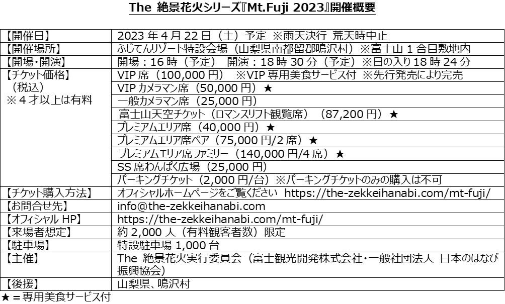 The 絶景花火実行委員会では、2023年=富士山の年、4月22日(土)18時30分頃(日の入り)より、富士山1合目の「ふじてんリゾート特設会場」にて、世界遺産登録10周年の富士山と桜を愛でながら世界最高峰の花火を愛でる、【The 絶景花火シリーズ『Mt.Fuji 2023』】(以下略称、絶景花火)を開催します。