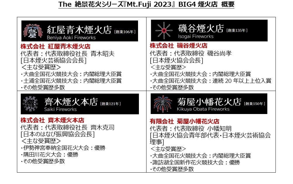 日本の花火業界BIG4(紅屋青木煙火店、磯谷煙火店、齊木煙火本店、菊屋小幡花火店)は全て創業100年を超える日本屈指の世界最高峰の花火師集団です。美麗な尺玉(10号)の花火を始め、スターマイン(連発花火)など多彩な花火が富士山を彩ります。
