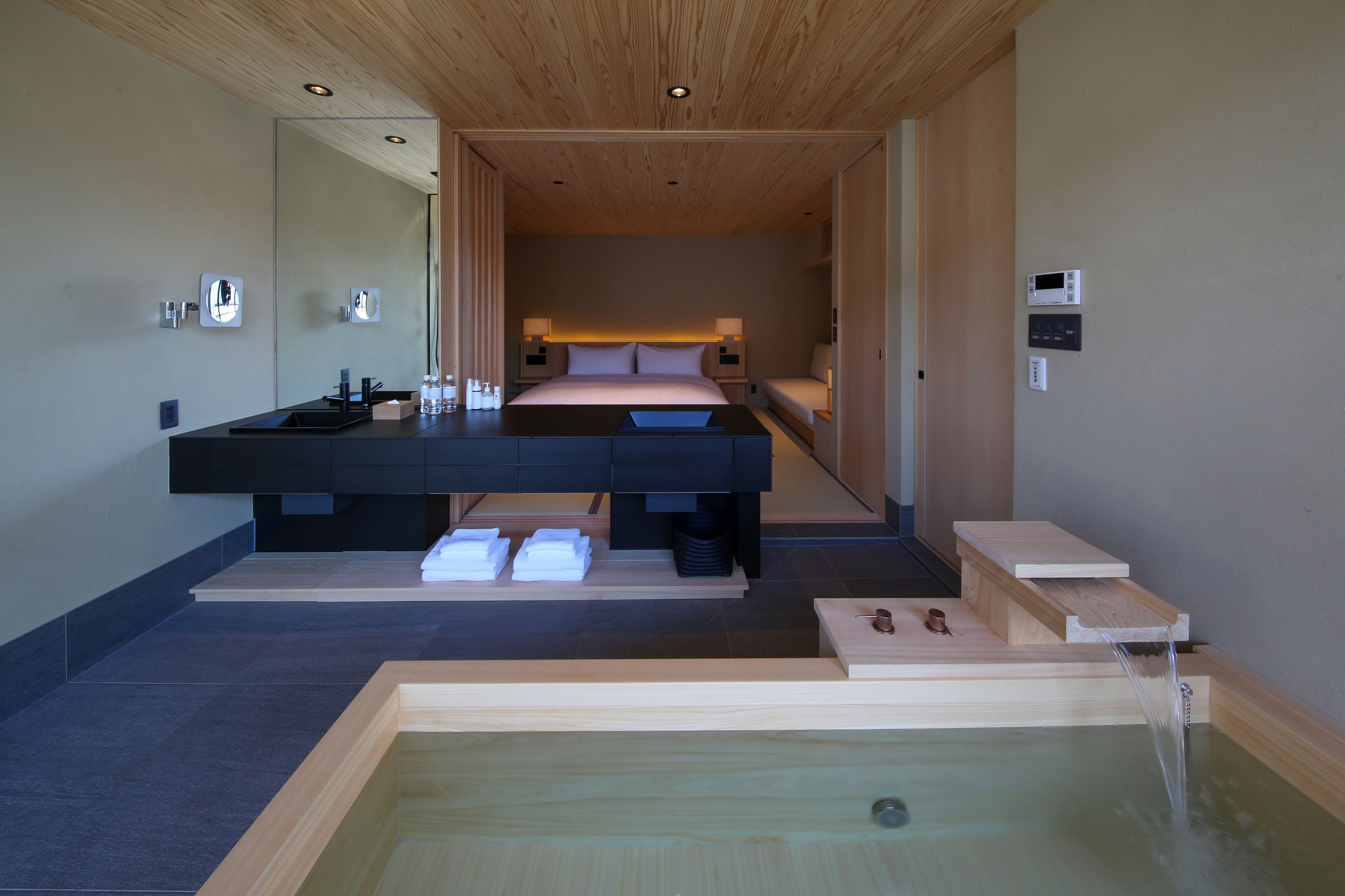 自然素材と飛騨の伝統工芸にこだわり抜き、自然を取り込むための大きな窓があるリビングやバスルーム、解放感と安らぎにあふれる寝室をご用意いたしました。優雅に泳ぐ彩とりどりの鯉を眺めながら檜風呂にゆったりとつかり、飛騨の四季折々の情景を存分にお楽しみいただけます。御嶽山を望む3階テラスでは、目の前に広がる趣きある町並みと自然に包まれるような一体感を。グラス片手に語らう贅沢で非日常なひと時をご提供いたします。