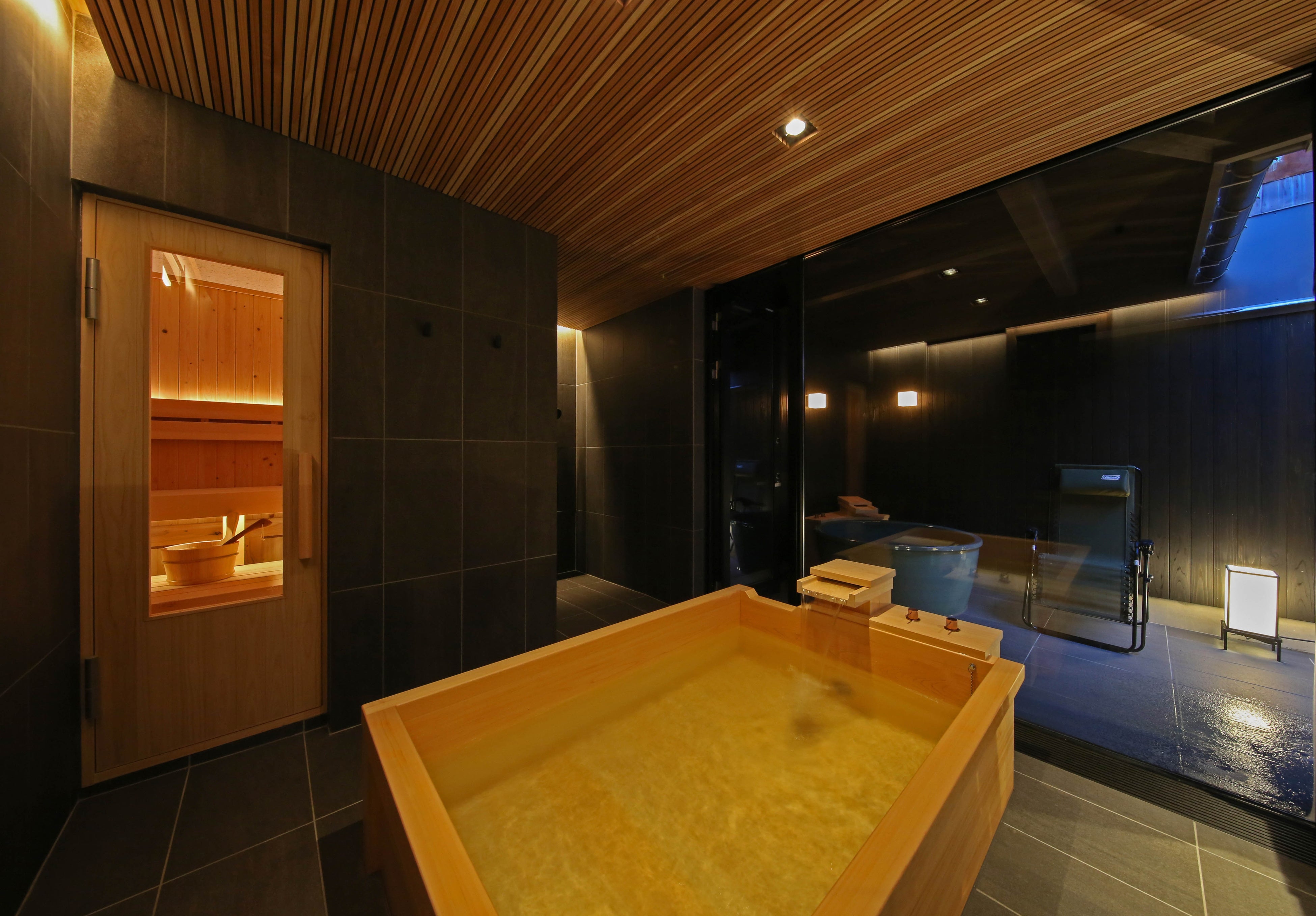 城下町の風情感じる瀬戸川沿いの中心に位置する築100年を超える伝統町家をリノベーション。飛騨の匠の技術が随所にみられ、飛騨の自然の恵みや自然素材へのこだわりを大切にした空間は、落ち着いた雰囲気を醸し出しています。浴室にはプライベートサウナとアロマオイル、飛騨産ヒノキ風呂、露天風呂スペースを完備しており、癒しの先にある「ととのう」という至福の体験をお楽しみいただけます。