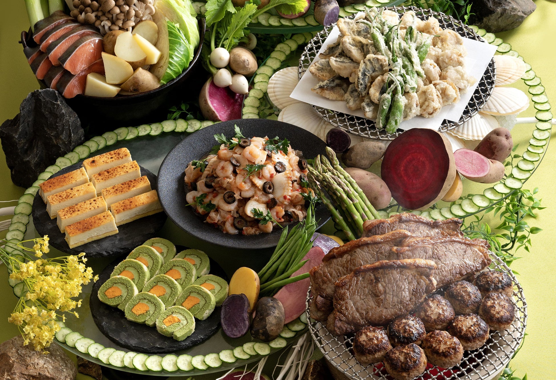 海鮮はもちろん、肉、野菜、スイーツなど、名物グルメが多く、食材の宝庫と呼ばれる北海道。魚介の旨みを最大限に引き出した海鮮アクアパッツァや、揚げたてのサクっとした食感がやみつきになるホッケと帆立の天ぷらなど、北海道産の食材を生かした絶品グルメをブッフェで心ゆくまでご堪能ください。