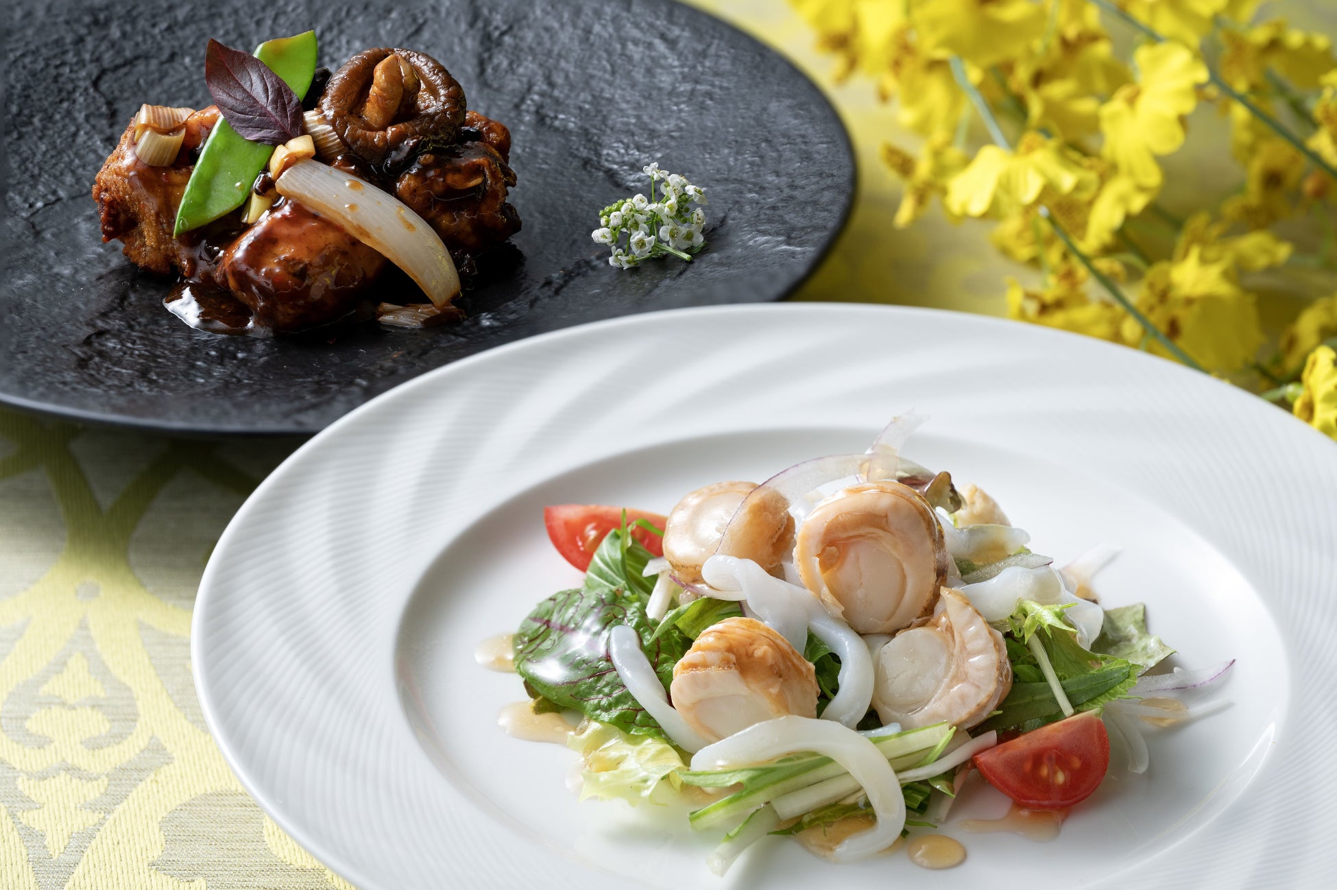 北海道産ベビー帆立とイカそうめん入りサラダ、知床どりとじゃがいものトウチ炒め 他