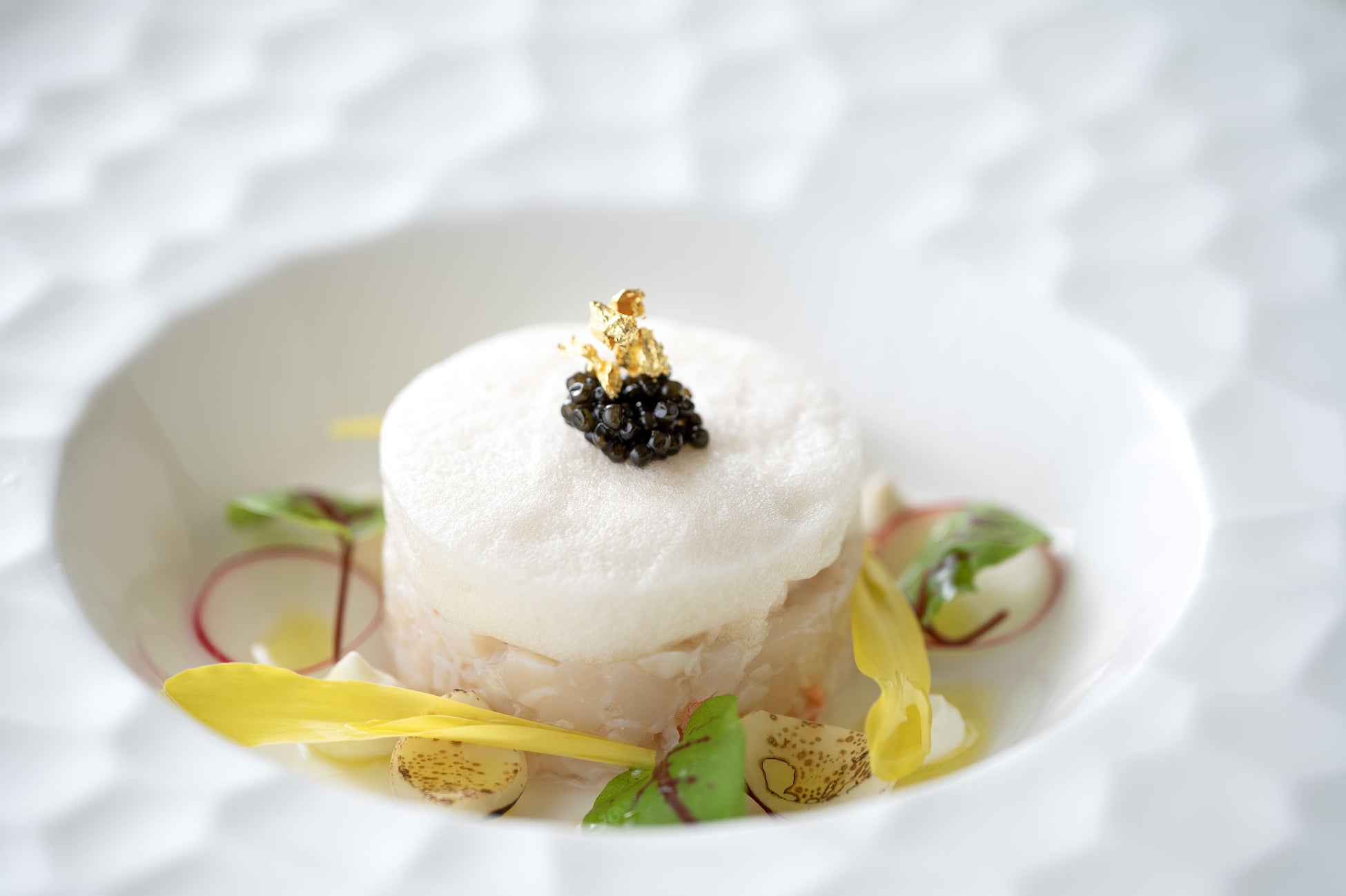 肉厚で濃厚な噴火湾産ホタテ貝とズワイガニカラマンシー風味アスピックの泡とキャビアを添えて