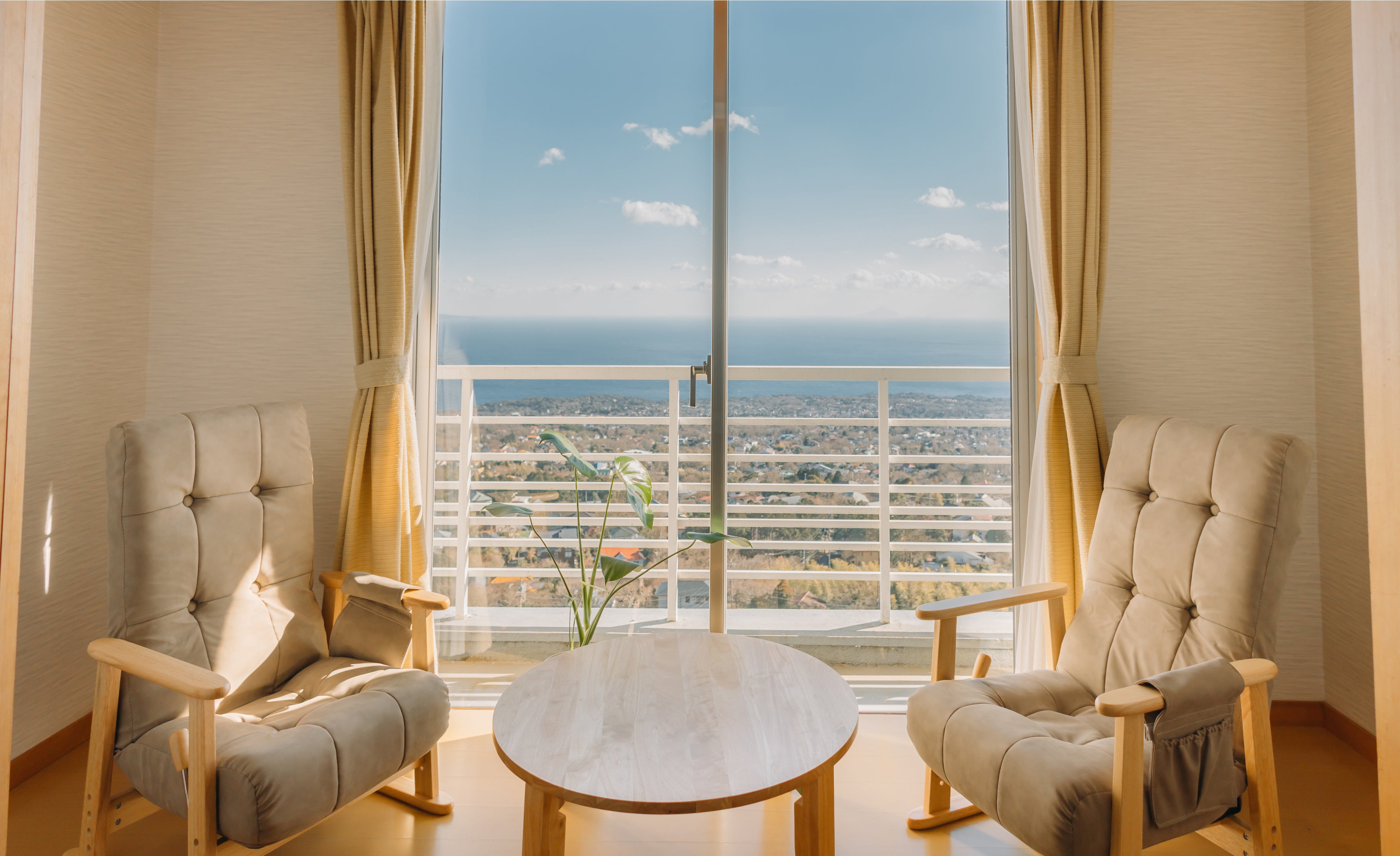 全室オーシャンビューの部屋から見られる海と、すぐ隣にある「大室山」。緑あふれる自然と目の前に広がる海は、最高のロケーションです。