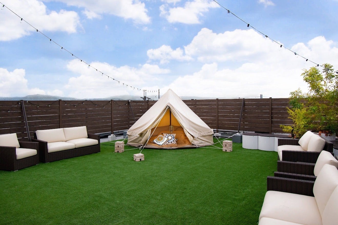 ソファは適度な弾力のあるドイツ産のものを設置し、テントの中にはクッションとこたつ。また、床には芝を敷き詰めているのでお子様も安心して裸足で歩けます。