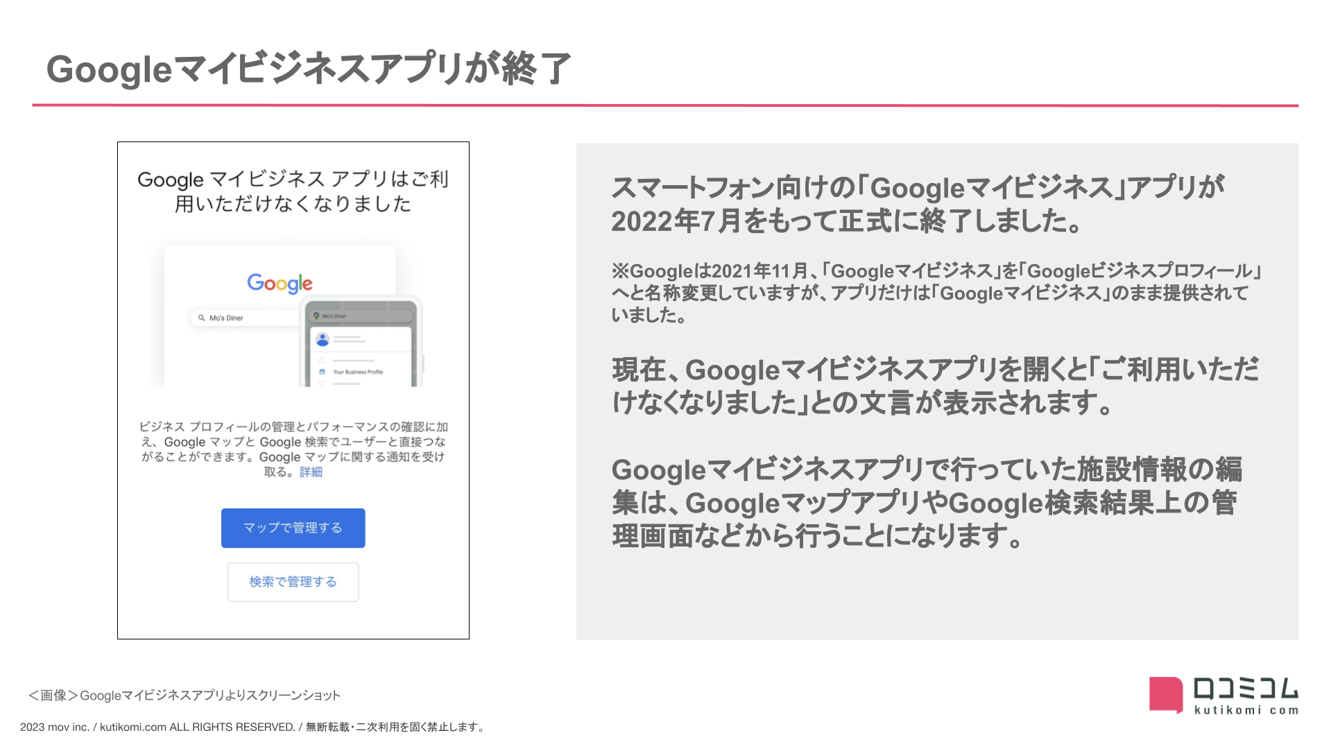 口コミサイトを”もっと”売上に変える店舗支援SaaS「口コミコム」を運営する株式会社mov(代表取締役:渡邊 誠、本社:東京都渋谷区、以下mov)は、2022年のGoogleマップ・Googleビジネスプロフィール(Googleマイビジネス)の更新情報や、口コミマーケティングノウハウなどの最新ニュースをまとめた「MEO・口コミマーケ年間まとめ【2022年】」を公開しました。