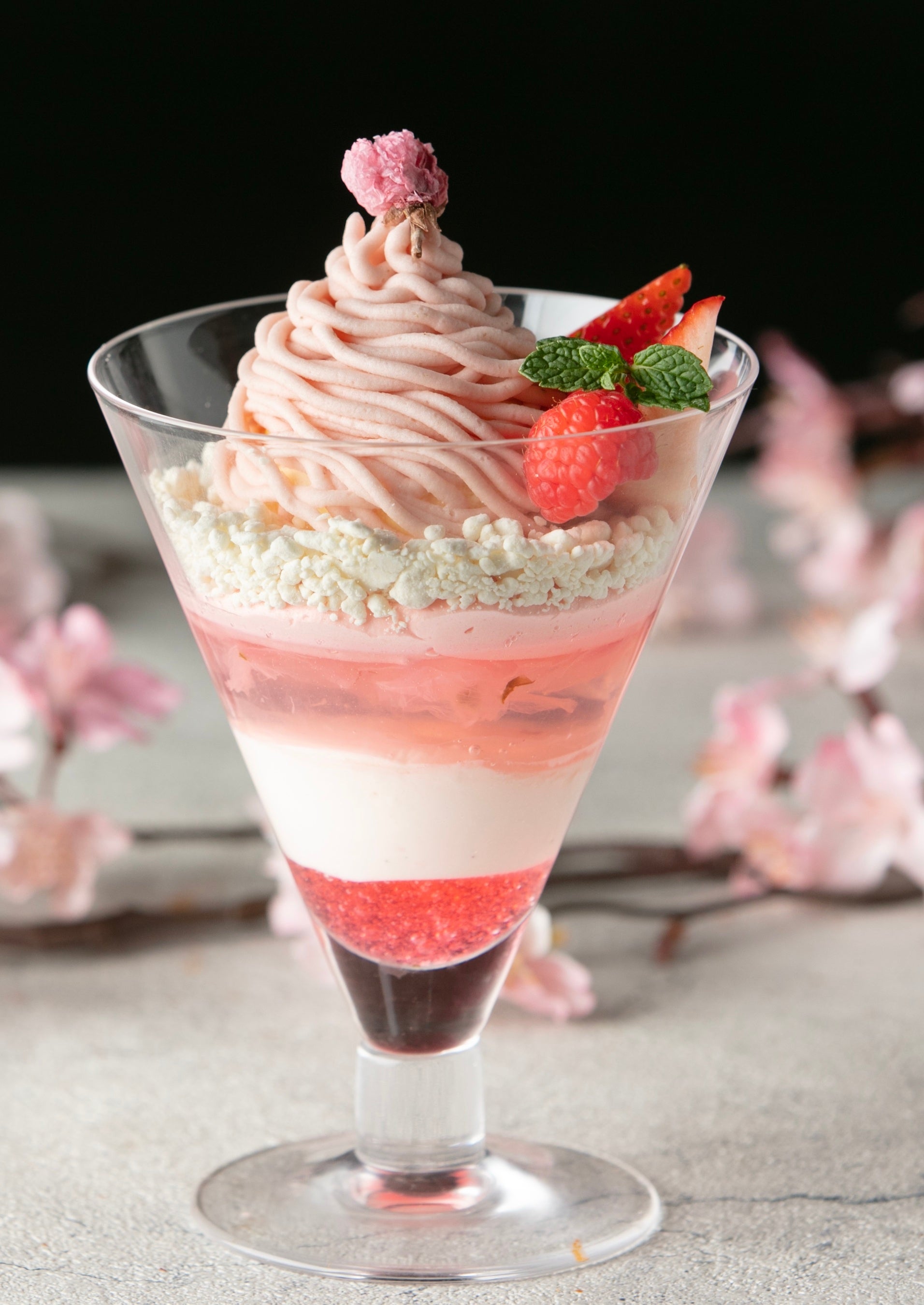 チーズのアンサンブル、桜と苺のフレジェ、桜ロールケーキ、桜風味の玉水晶、フルーツ