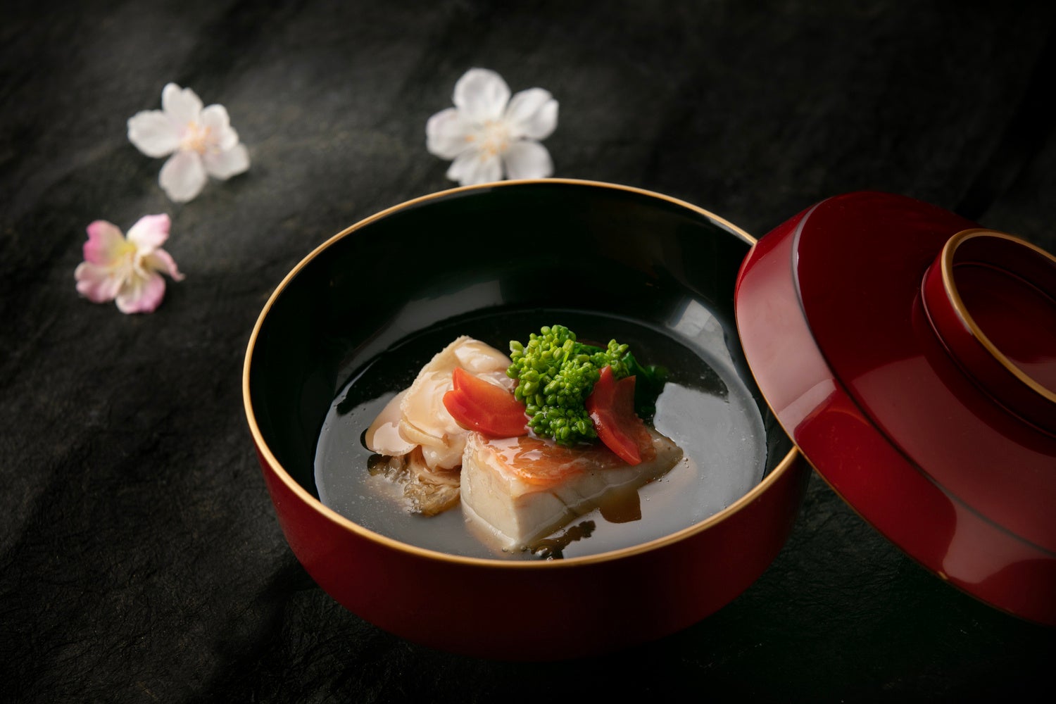 先付、桜手毬寿司、向付、金目鯛甘酒焼き
