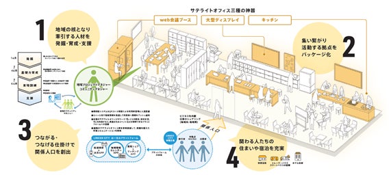 人を中心とした“場”づくりを実践してきた当社が、「サテライトオフィス」運営を牽引するコミュニティマネジャーの発掘・育成とデジタルツールを活用した「サテライトオフィス」空間への仕掛けなどの企画・基本設計を担当します。当社のフィロソフィーでもある『環境が変われば行動が変わり、行動が変われば意識が変わる』を推進してまいります。