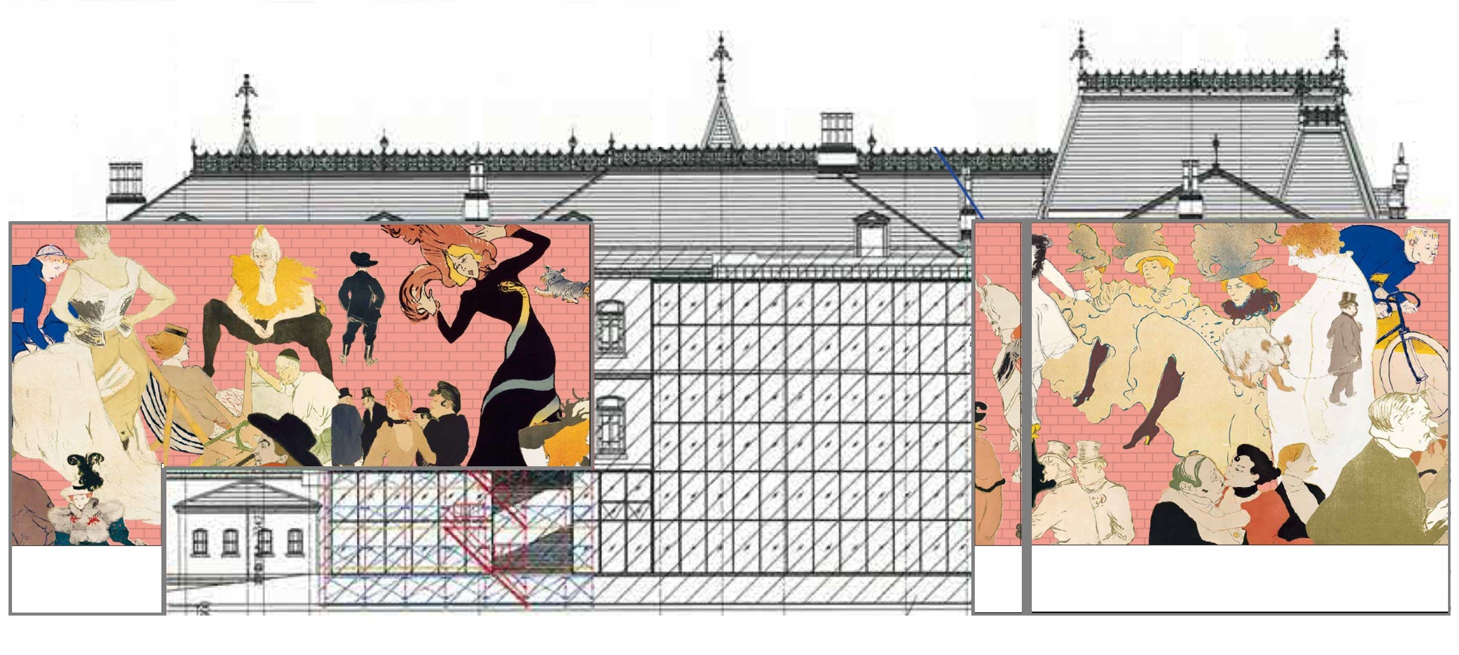 今回は、建物のメンテナンスのために、三菱一号館の外壁を取り囲むメッシュ素材の仮囲いを設置することが決定しており、美術館のロゴマークをデザインしていただいた服部一成氏に、当館のアンリ・ド・トゥールーズ=ロートレック作品をモティーフに、全28作品を自在にコラージュした高さ14.4m、総面積約1,250㎡におよぶ、大型の仮囲い装飾をデザインしていただきました。ロートレックが描いた19世紀末のパリの賑わいが、時空を超えて丸の内に移動してきたような大壁面が現れます。